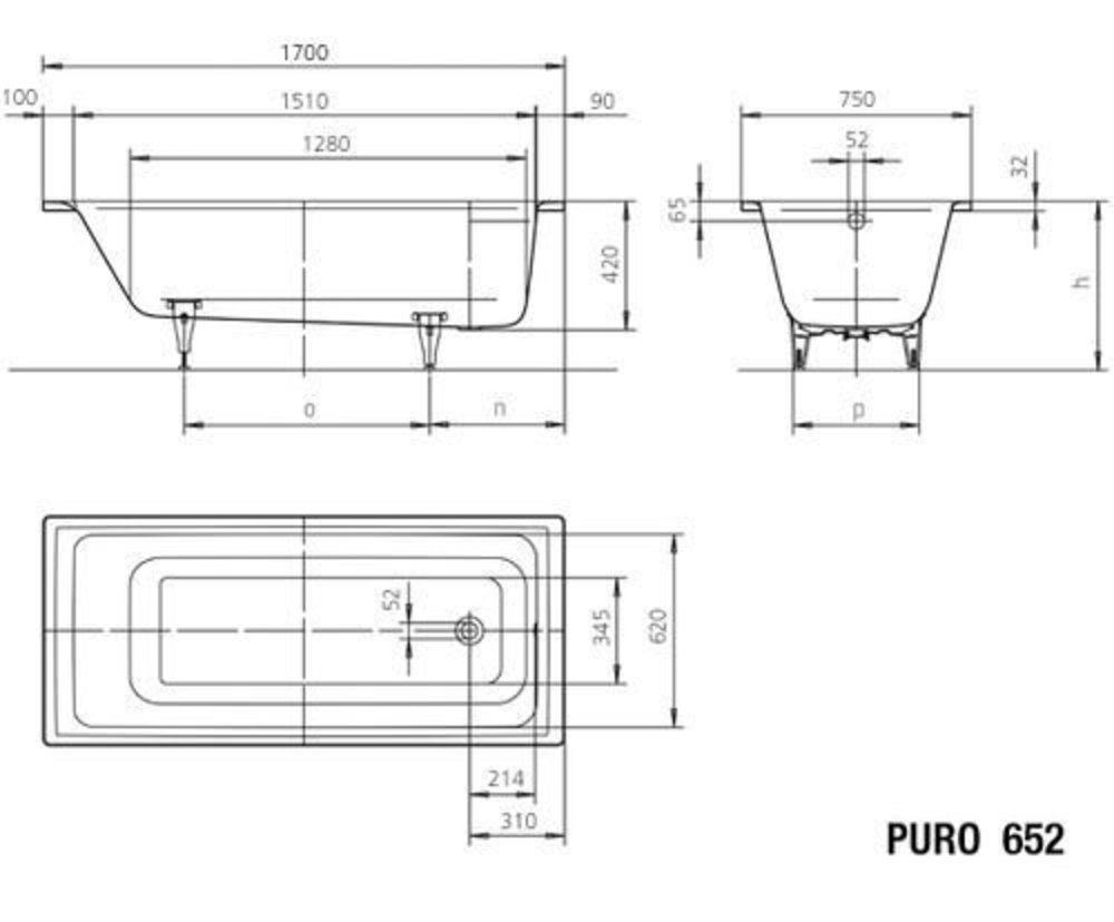 Стальная ванна Kaldewei Puro мод. 652, 170 х 75 х 42 см, easy-clean, 2562.0001.3001