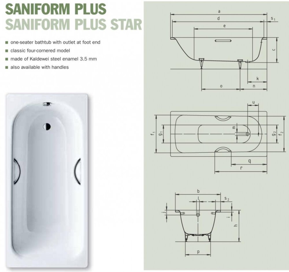 Стальная ванна Kaldewei Saniform Plus Star мод. 330, 140 х 70 х 41 см, с отверстиями для ручек