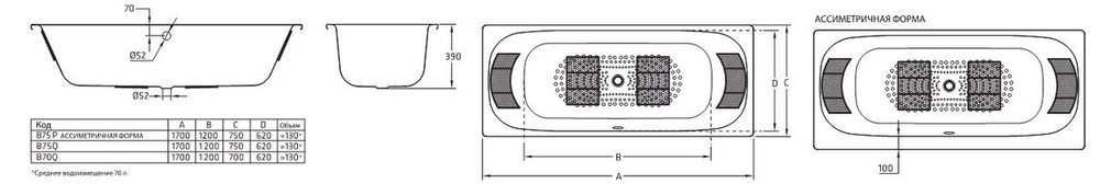 Ванна стальная BLB Universal Duo HG B70Q 170 х 70 см, с шумоизоляцией, асимметричная