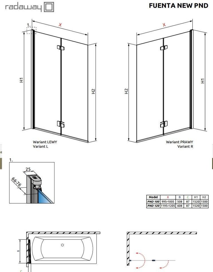 Fuenta New PND это двустворчатая стеклянная шторка для ванны. Шторка складывается по середине внутрь ванны, стекло ближе стены поворачивается внутрь и наружу ванны.