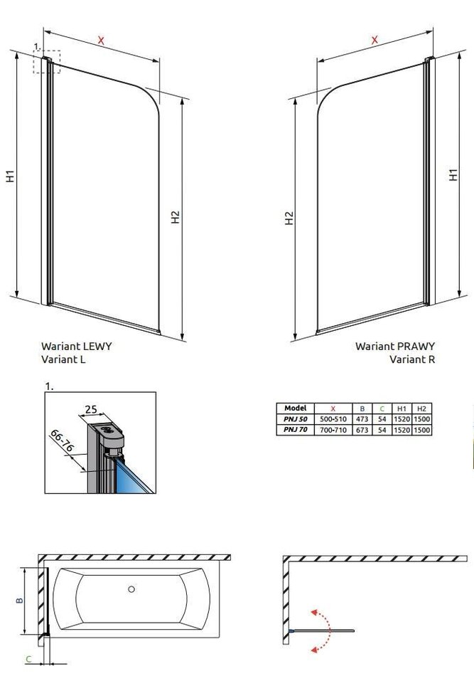 Одностворчатая шторка для ванны Eos PNJ — створка поворачивается внутрь и наружу ванны.