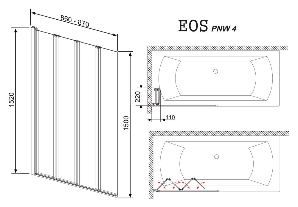 - Складная душевая шторка cостоит из 4 секций. Складывается гармошкой во внутрь ванны. В сложенном виде шторка занимает только 22 см. Благодаря этому ее можно монтировать на стене на которой находиться смеситель