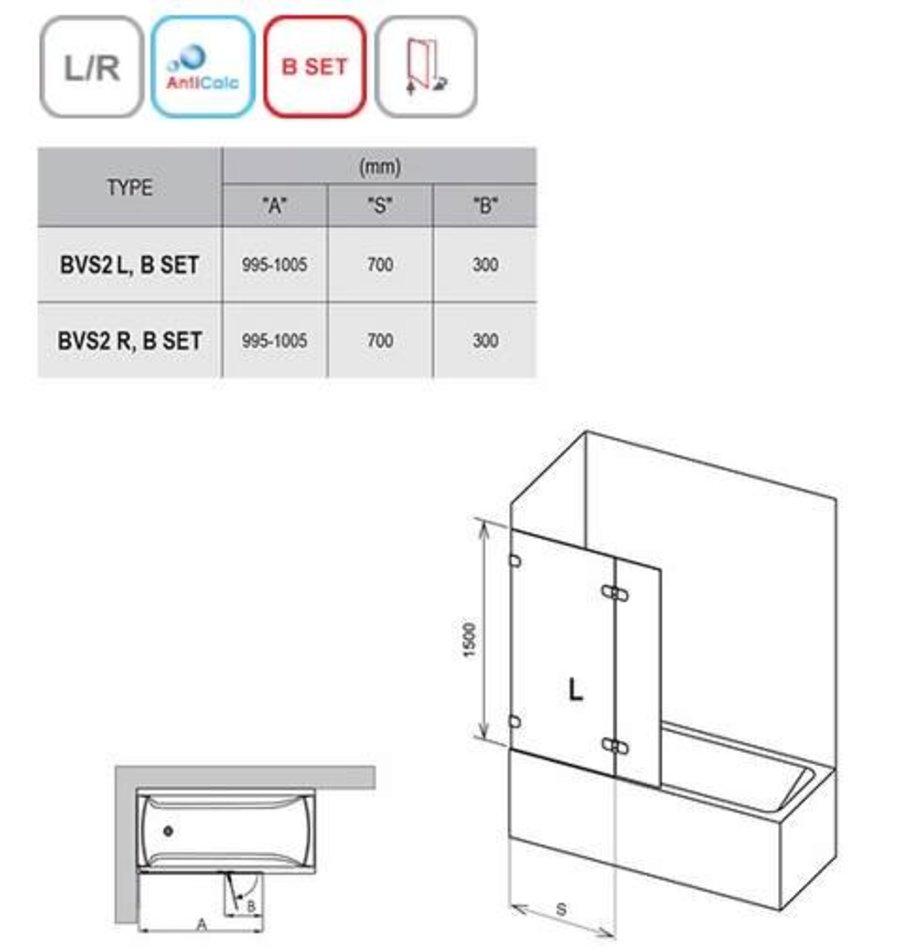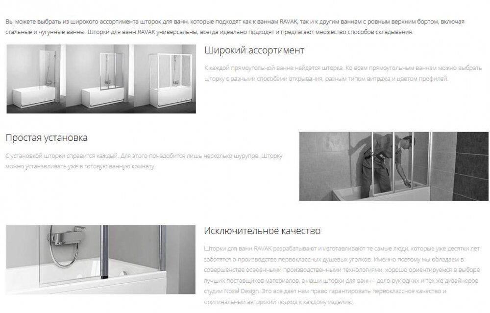 Штора BVS2 состоит из двух частей: широкой неподвижной секции и узкой створки, поворачивающейся на петлях. Это яркое дизайнерское решение Ravak для прямоугольных ванн Classic, Vanda II, Campanula II возможно использование и другими моделями, у которых передний борт плоский и образует прямой угол со стеной.