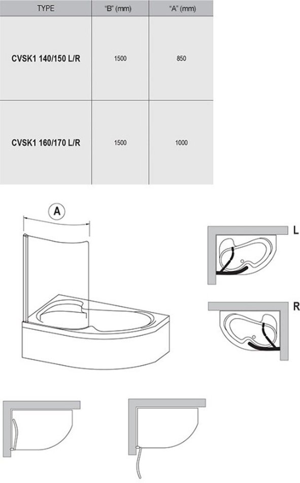 Размер CVSK1 в L/R вариантах заказывается тех же размеров, что и выбранная ванна Rosa.