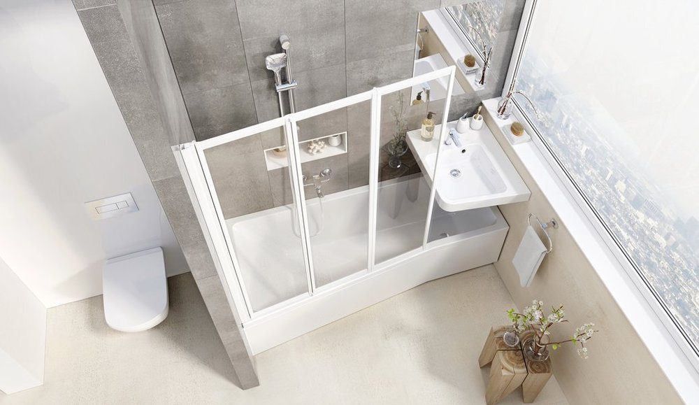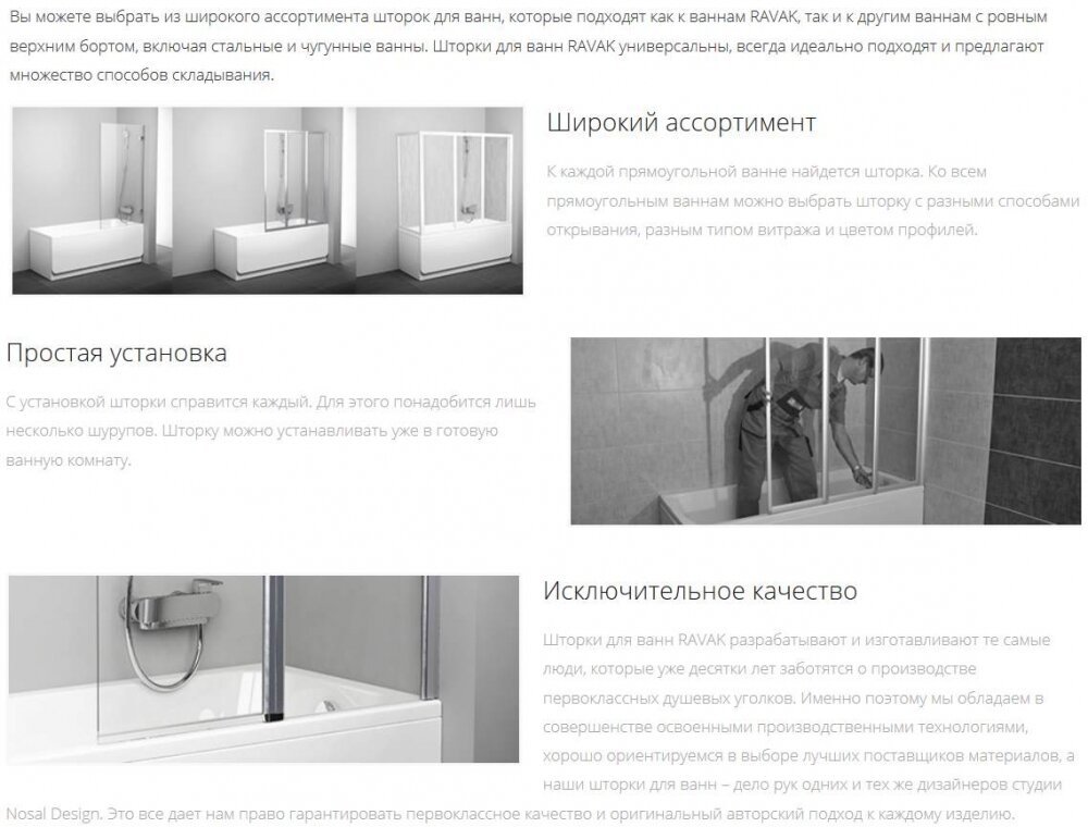 Все три секции душевой шторы VS3 – подвижные. Полотно компактно складывается вовнутрь, открывает удобный доступ к чаше и не занимает полезного места в ванной комнате. Шторка предназначена для классических ванн с прямым передним краем, при небольшой адаптации подходит к асимметричной модели Ravak BeHappy II.