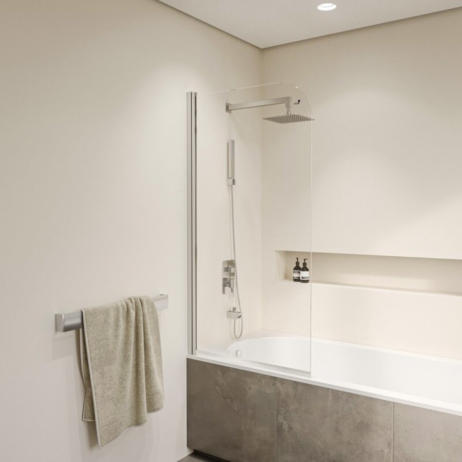 Шторка на ванну маятниковая. Толщина закаленного, безопасного стекла 6 мм. Функция подъема стекла с доводчиком.