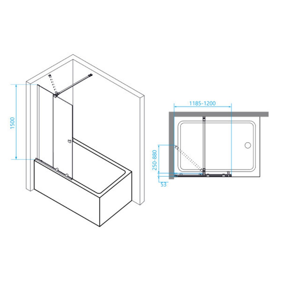 - Шторка на ванну неподвижная с раздвижной дверью на нижних роликах. Верхний держатель 1000 мм.