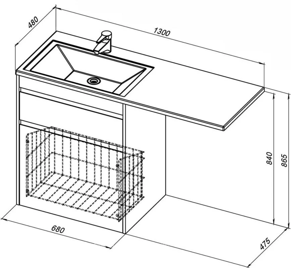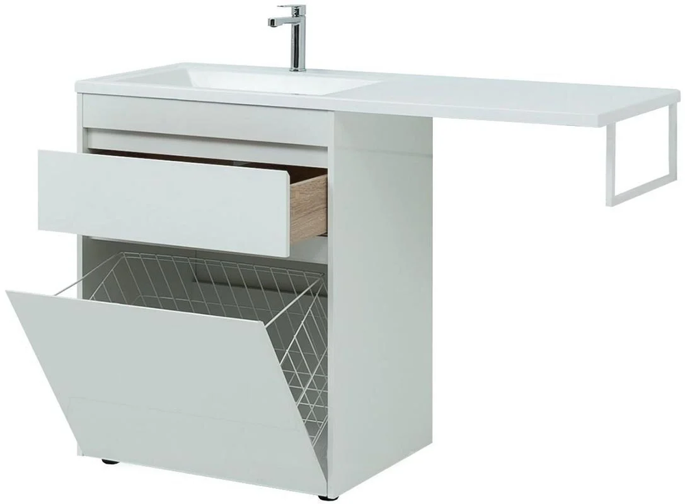 Корпус тумбы выполнен из влагостойкого ЛДСП, а фасад – из МДФ с покрытием эмалью. В напольной тумбе шириной 680 мм место хранения предусмотрено в выдвижном ящике, а также отделе с бельевой корзиной, оснащенных механизмами доводчиков, чтобы ход ящика при открывании/закрывании был плавным и без неприятных звуков. Тумбу можно использовать и без соседства со стиральной машиной, а свободное пространство под платформой раковины занять подкатной тумбой, полочками для полотенец или столиком.