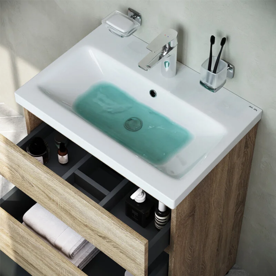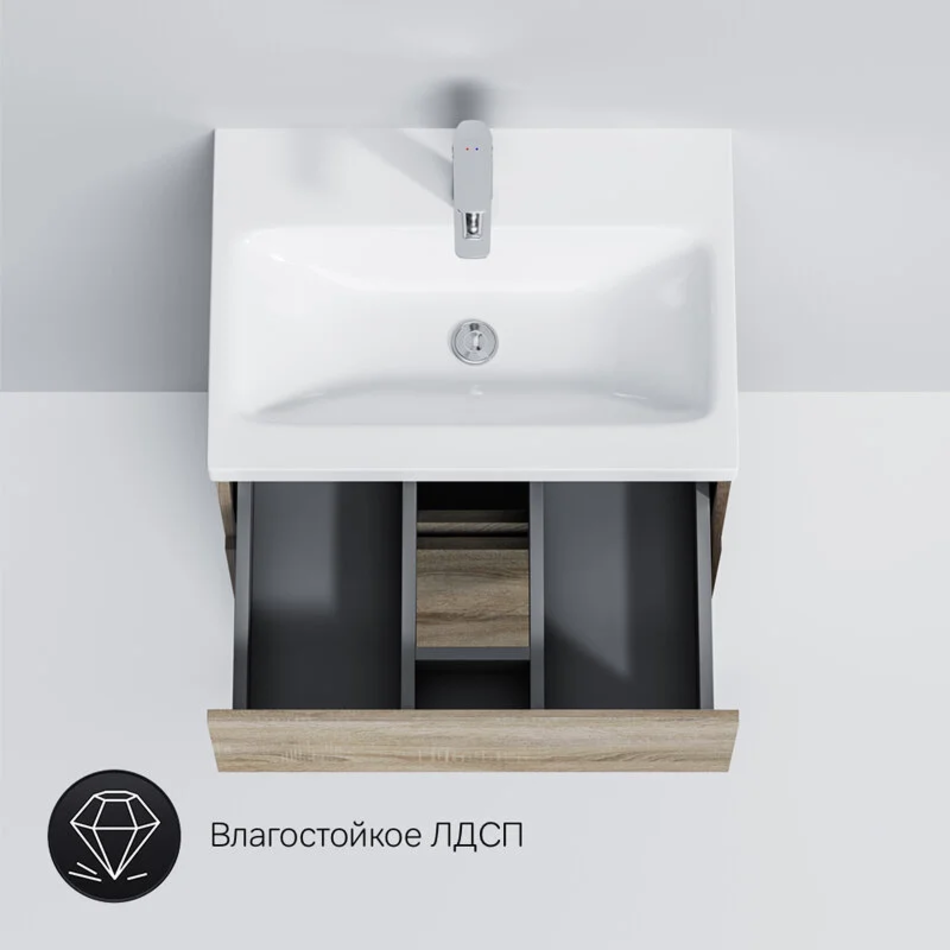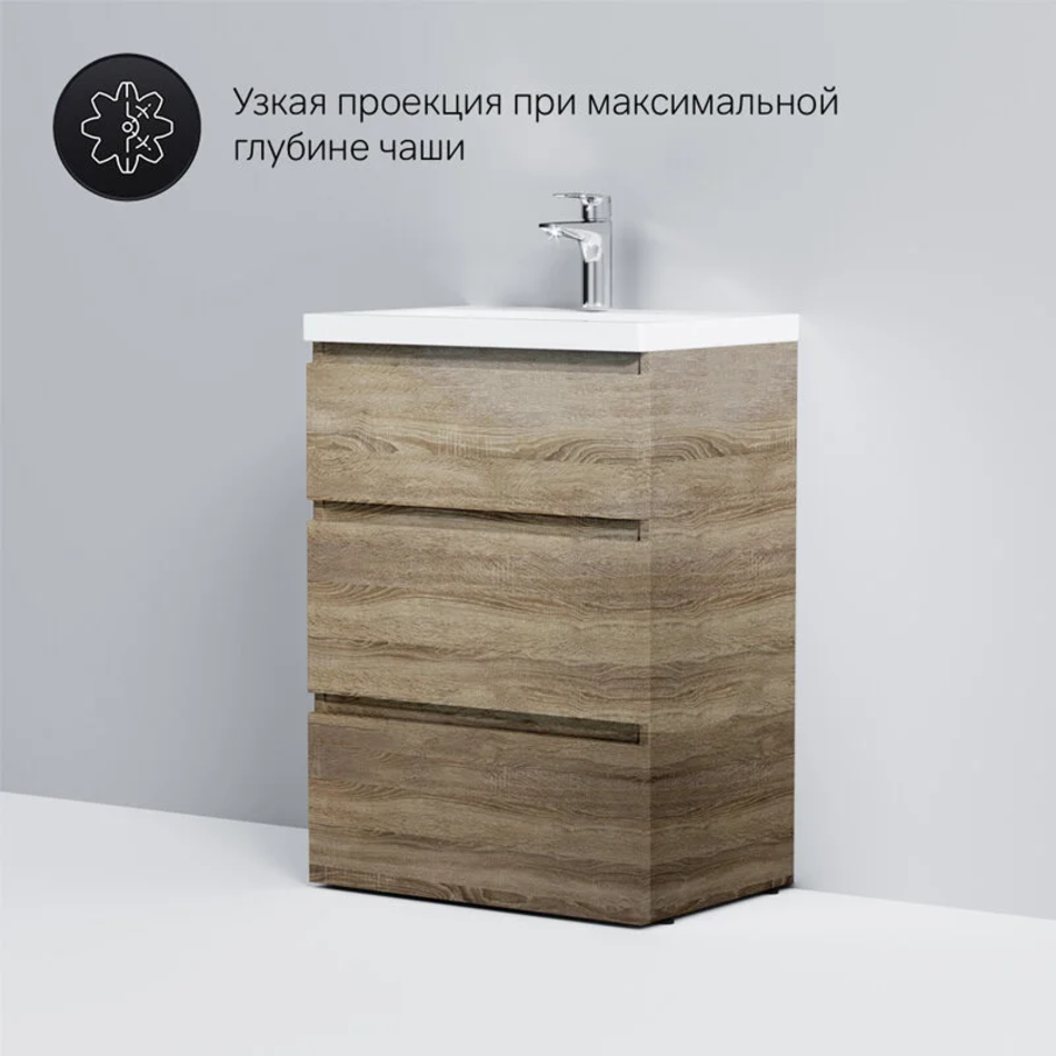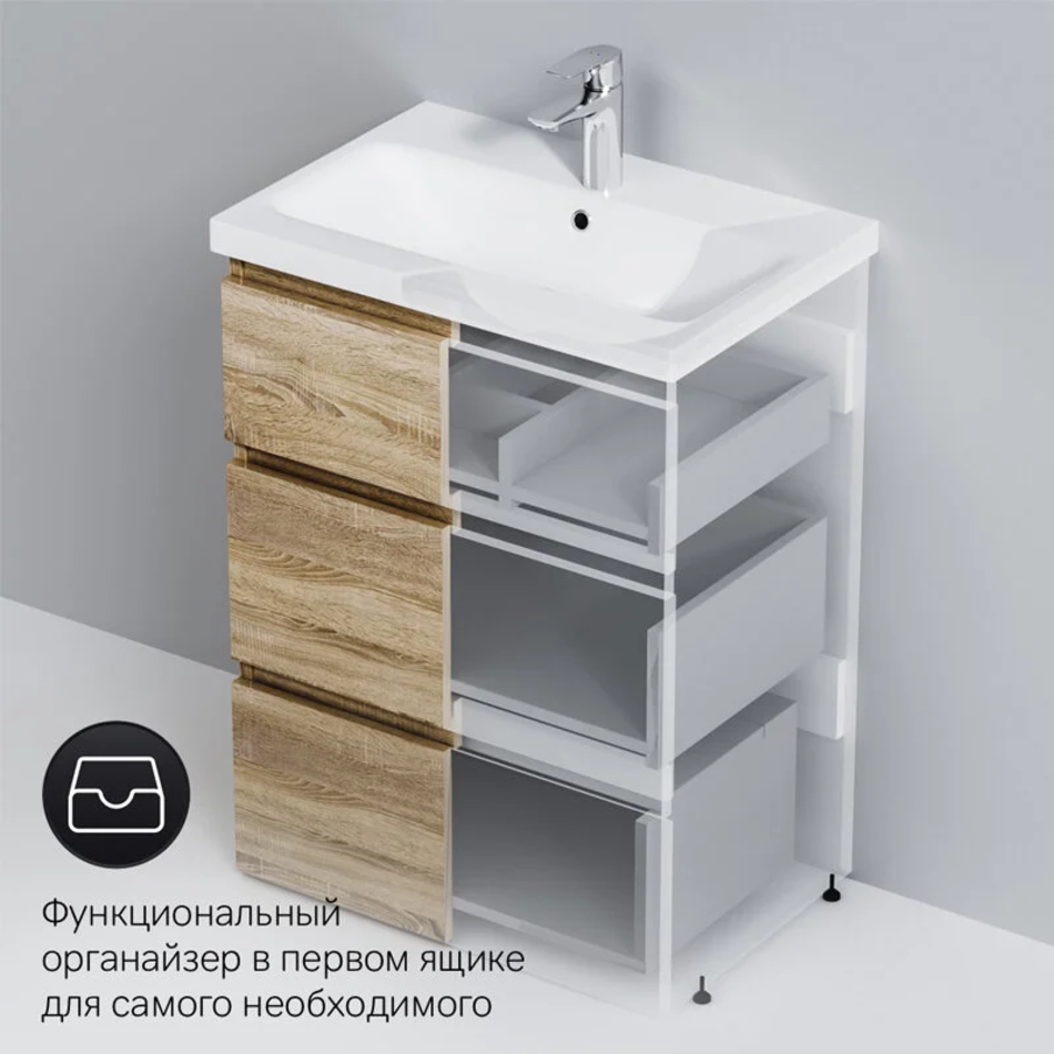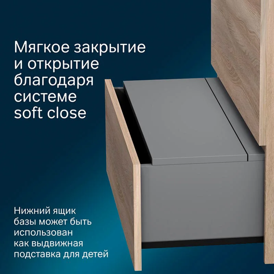 Уникальный нижний ящик базы может быть использован как: выдвижная подставка для детей, для удобного мытья рук (выдерживает нагрузку до 60 кг); дополнительная ниша для хранения (экономия пространства ванной комнаты).