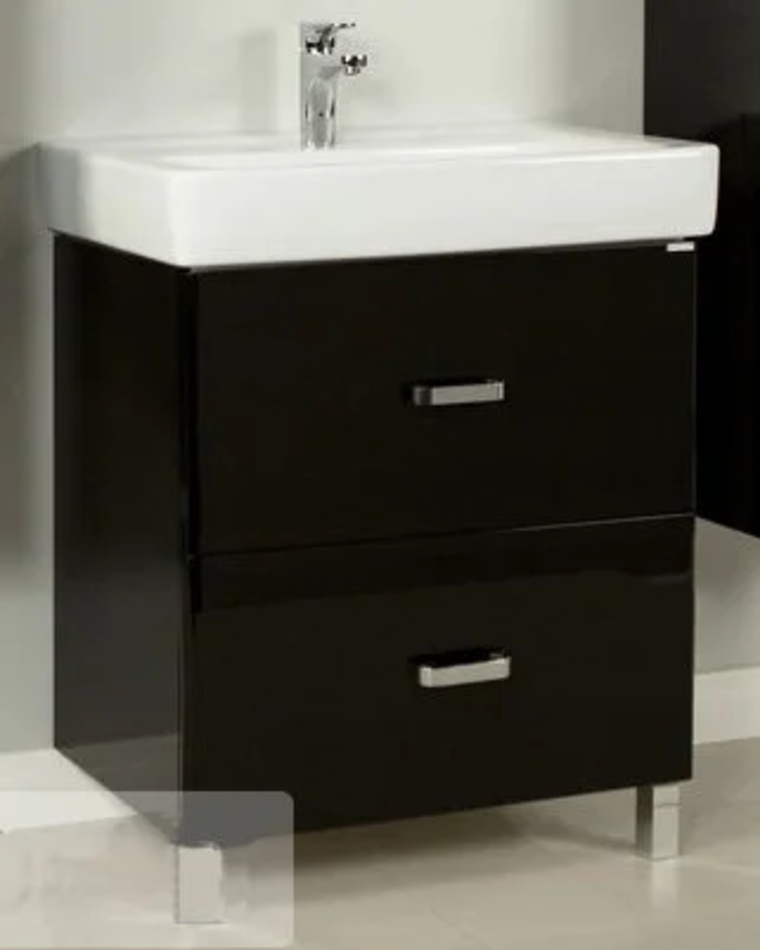 Стильная лаконичная модель, укомплектованная прямоугольной керамической раковиной с широкой удобной чашей. В тумбе установлены два ящика, изготовленные из декоративной влагостойкой ДСП. Нижний ящик тумбы – широкий и вместительный – предназначен для крупных предметов, а в верхнем имеется специальная организация пространства, позволяющая хранить мелкие вещи.
