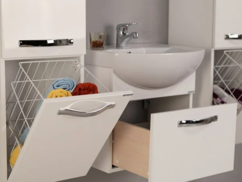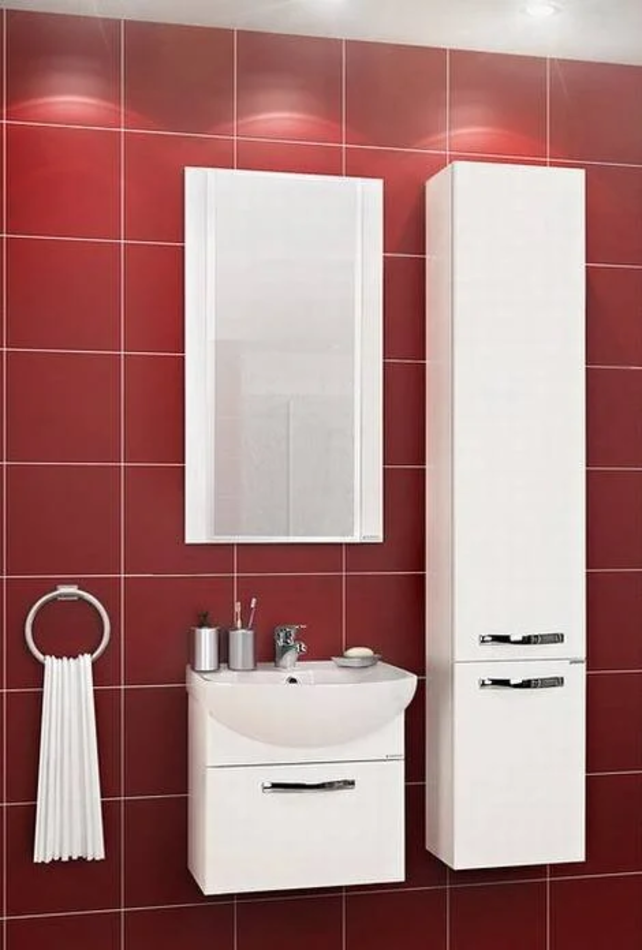 Набор «Ария 50» состоит из подвесной тумбы, зеркала и подвесного шкафа-колонны. В тумбе за фасадом расположен ящик из влагостойкой ДСП со вставками, организующими его пространство.