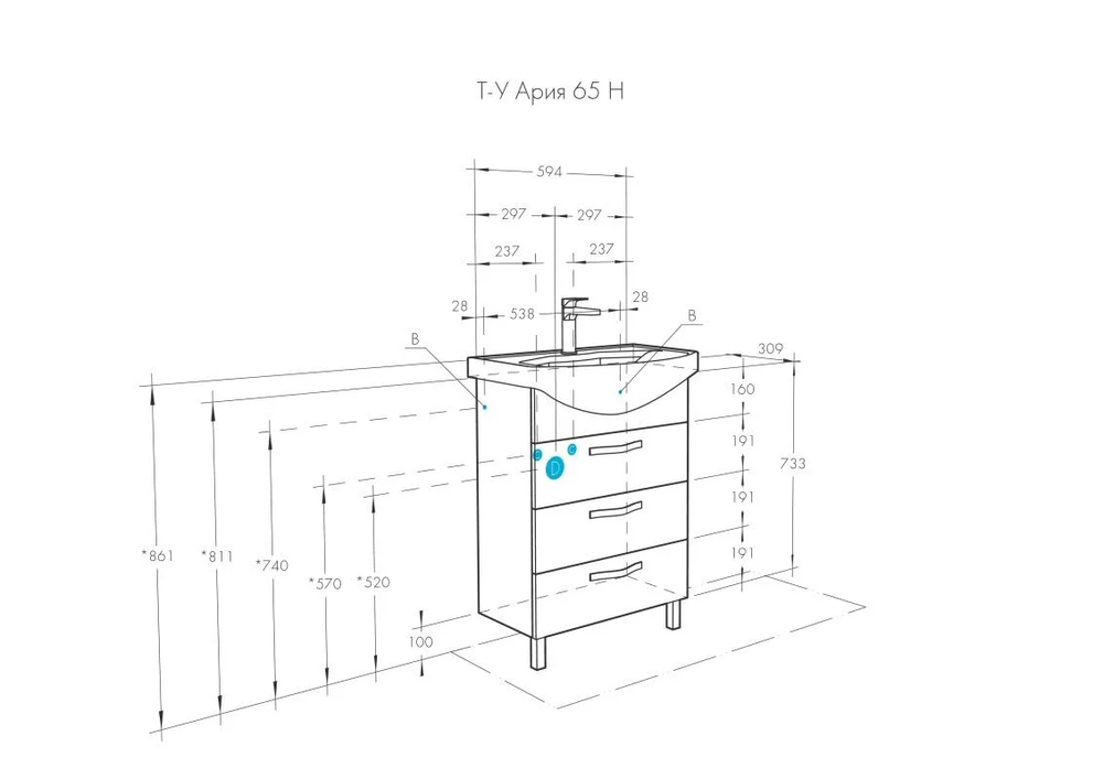 Модификация модели «Ария». Тумба и колонна устанавливаются на пол при помощи регулируемых по высоте ножек. В тумбе – три выдвижных ящика из влагостойкой ДСП, верхний из которых снабжен организацией пространства. В колонне внизу расположен откидной фасад с бельевой корзиной, а за верхним распашным фасадом расположены регулируемые по высоте полочки.