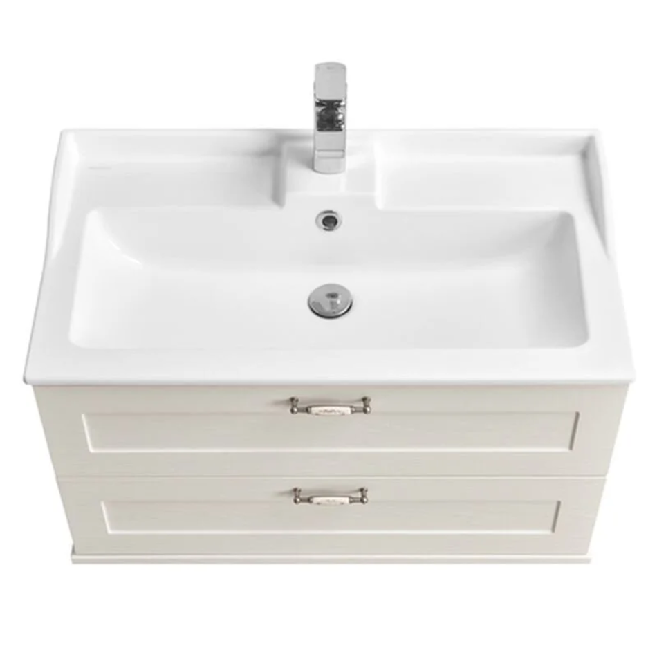 Тумба комплектуется раковиной ФАБИА из литого мрамора собственного производства АКВАТОН. Изящные формы, пристенные бортики и площадки делают её очень удобной. Подвесная тумба установлена на надежные навесы, которые позволяют отрегулировать ее положение. В тумбе установлены 2 ящика, и, помимо стандартного подключения водоснабжения и канализации (из стены), предусмотрена возможность подключения труб снизу. Все петли снабжены интегрированными доводчиками. На изящной полочке зеркала можно разместить мелочи, которые всегда должны быть под рукой. В нижней части колонны установлена бельевая корзина, а в верхней - полки.
