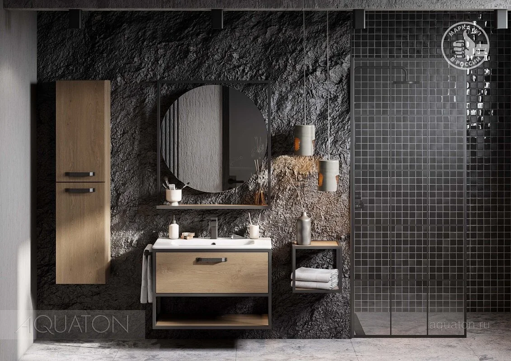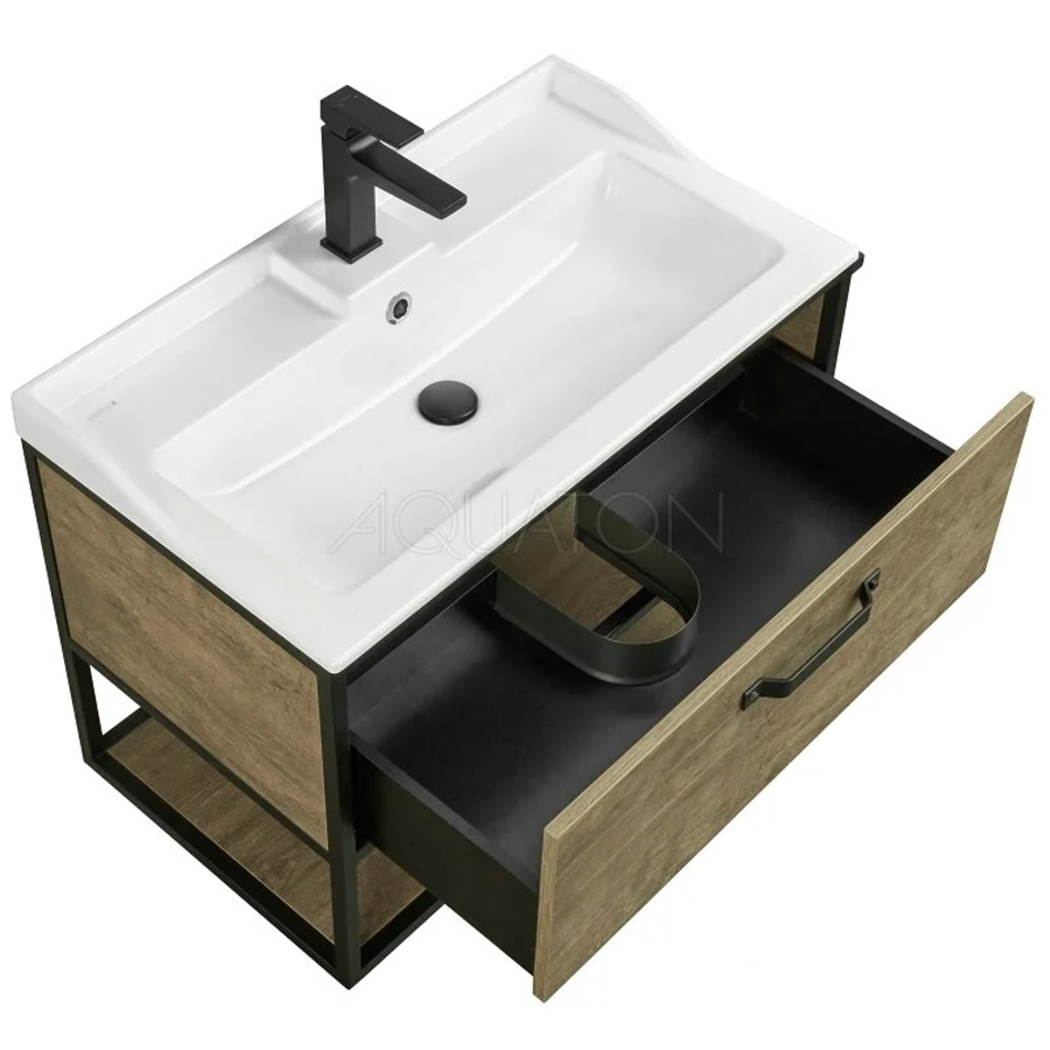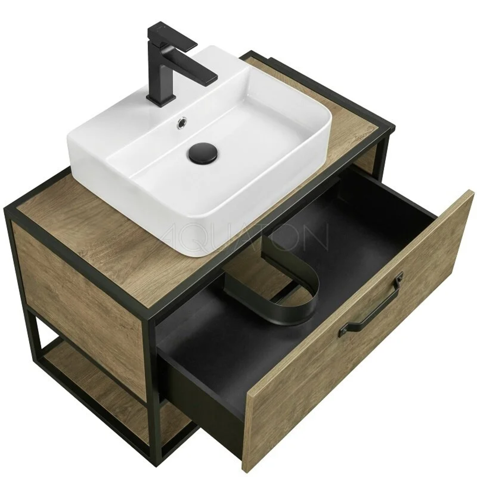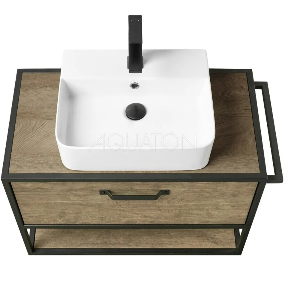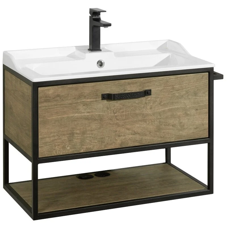 Тумба Лофт Фабрик 80 в цвете Дуб Кантри – это сочетание насыщенного древесного декора и благородства металла. Удобный вместительный ящик, снабженный направляющими плавного выдвижения, и открытая нижняя полка позволят разместить все необходимое. Для данной тумбы доступно два варианта комплектации: с раковиной Фабиа 80 из прочного литьевого мрамора и с накладной керамической раковиной на столешницу (столешница заказывается отдельно). Оригинальная ручка идеально сочетается с металлическими черными профилями и полотенцедержателем. Полотенцедержатель можно установить опционально по желанию клиента слева или справа.