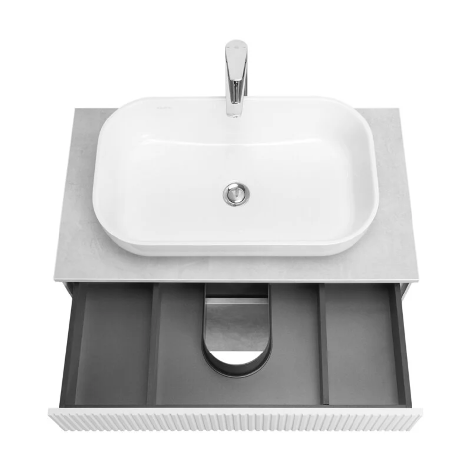 Верхний фасад выполнен из МДФ с реечной фрезеровкой в белой матовой пленке с эффектом soft touch, а нижний фасад из ламинированной влагостойкой ДСП Слэйт