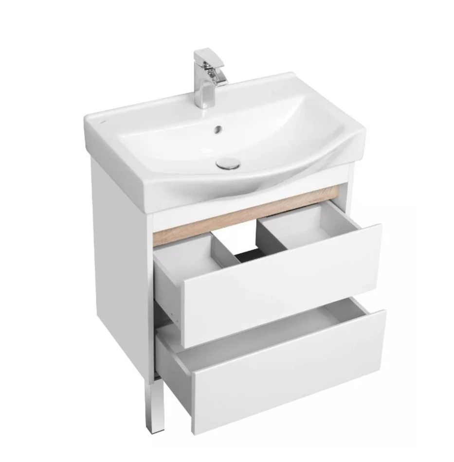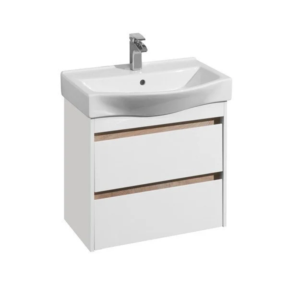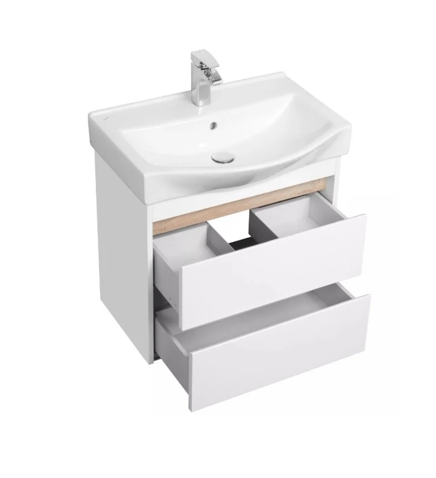 Тумба под раковину Размер: 61.6 x 35.7 x 55.4 см Монтаж: подвесной Ящики выдвижные: 2 С доводчиками Покрытие: краска Материал: ЛДСП, МДФ Форма: прямоугольная Цвет: белый глянцевый/дуб эндгрейн