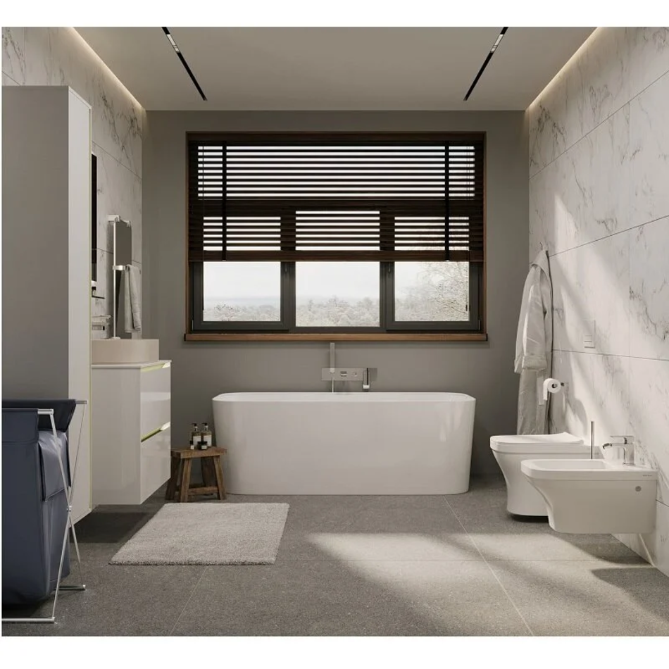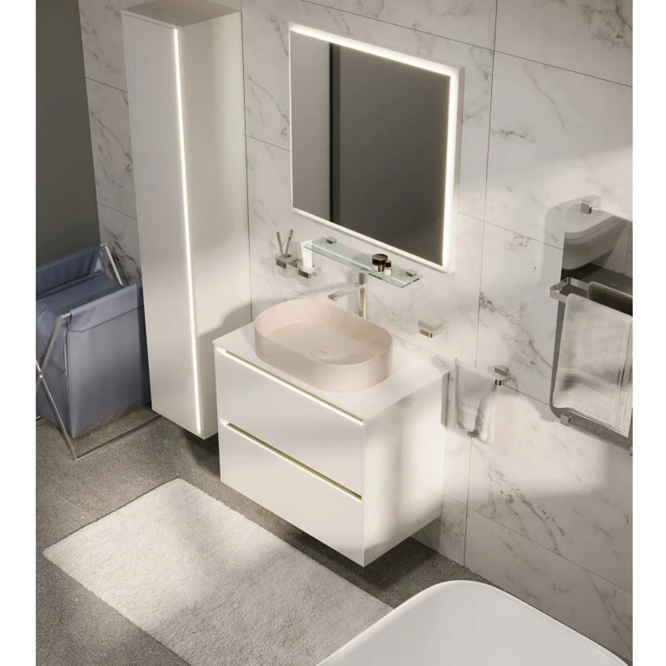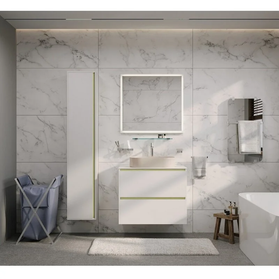 Детали фасада и декоративного профиля установленного на корпусе имеют фрезеровку и наклон 45 градусов, что делает открывание тумбы и пенала очень комфортным. Столешницы из 70-120 см из искусственного камня в белом цвете и акрилового камня в оттенках альба, оникс и сатин предназначены для установки накладных раковин. Зеркала Activity с LED подсветкой оснащены сенсорным выключателем на корпусе и функцией «антизапотевание». В качестве дополнительного оснащения мебели в коллекции предусмотрен комплект пластиковых прозрачных контейнеров BANIO из 3-х шт. разного размера.