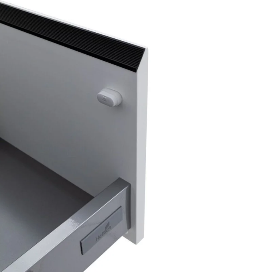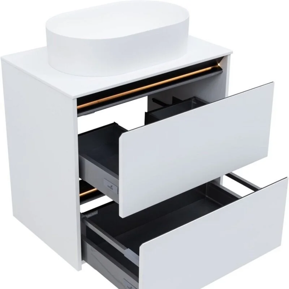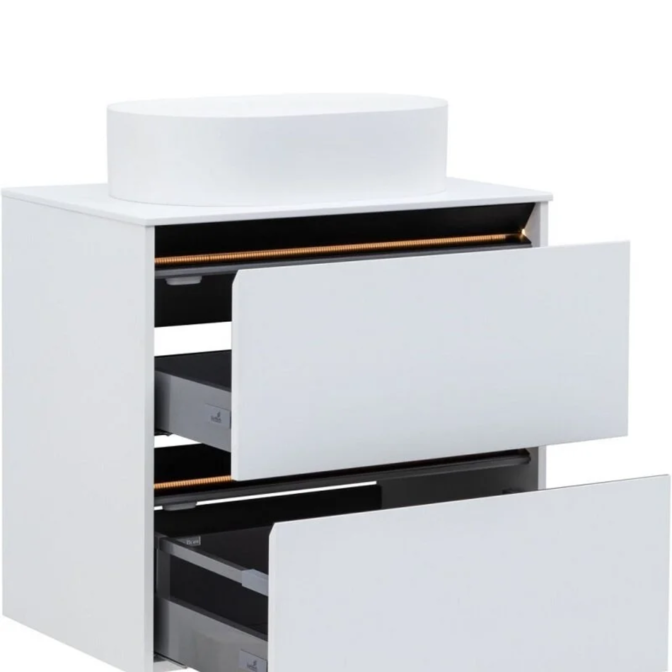 Корпус мебели на верхнем торце фасада имеет металлический декоративный профиль в цвете черный или олива. Тумбы и пеналы комплектуются подсветкой в теплом тоне и специальным магнитным датчиком, который позволяет использовать подсветку в 2-х режимах: «декоративная подсветка» - всегда включена и «функциональная подсветка» - включается при открывании ящика или пенала.