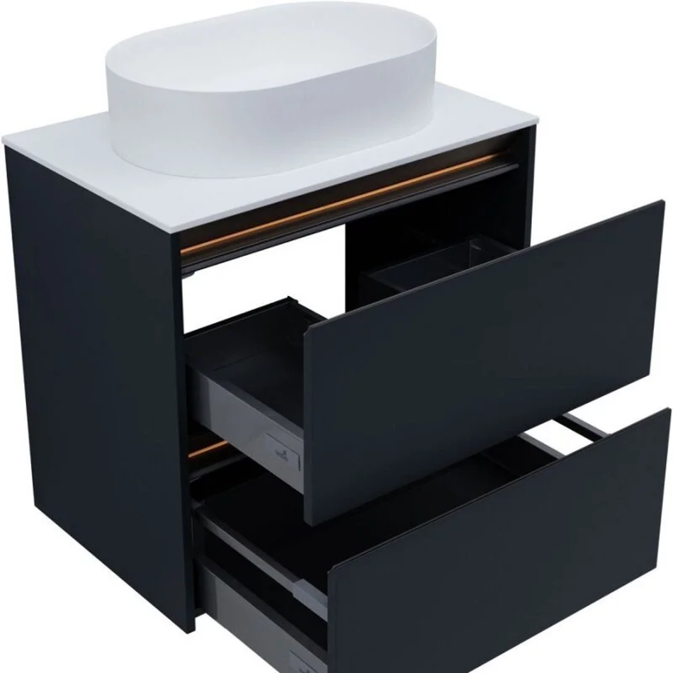Корпус мебели на верхнем торце фасада имеет металлический декоративный профиль в цвете черный или олива. Тумбы и пеналы комплектуются подсветкой в теплом тоне и специальным магнитным датчиком, который позволяет использовать подсветку в 2-х режимах: «декоративная подсветка» - всегда включена и «функциональная подсветка» - включается при открывании ящика или пенала.
