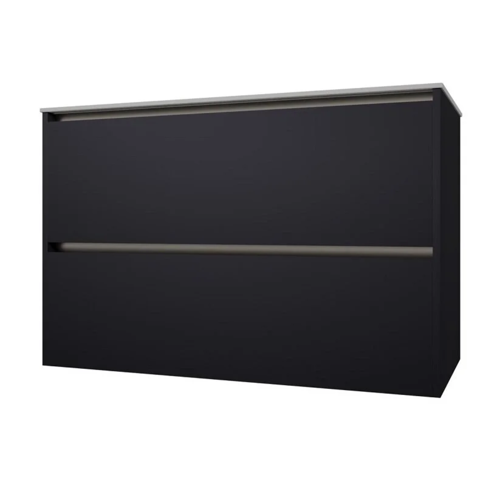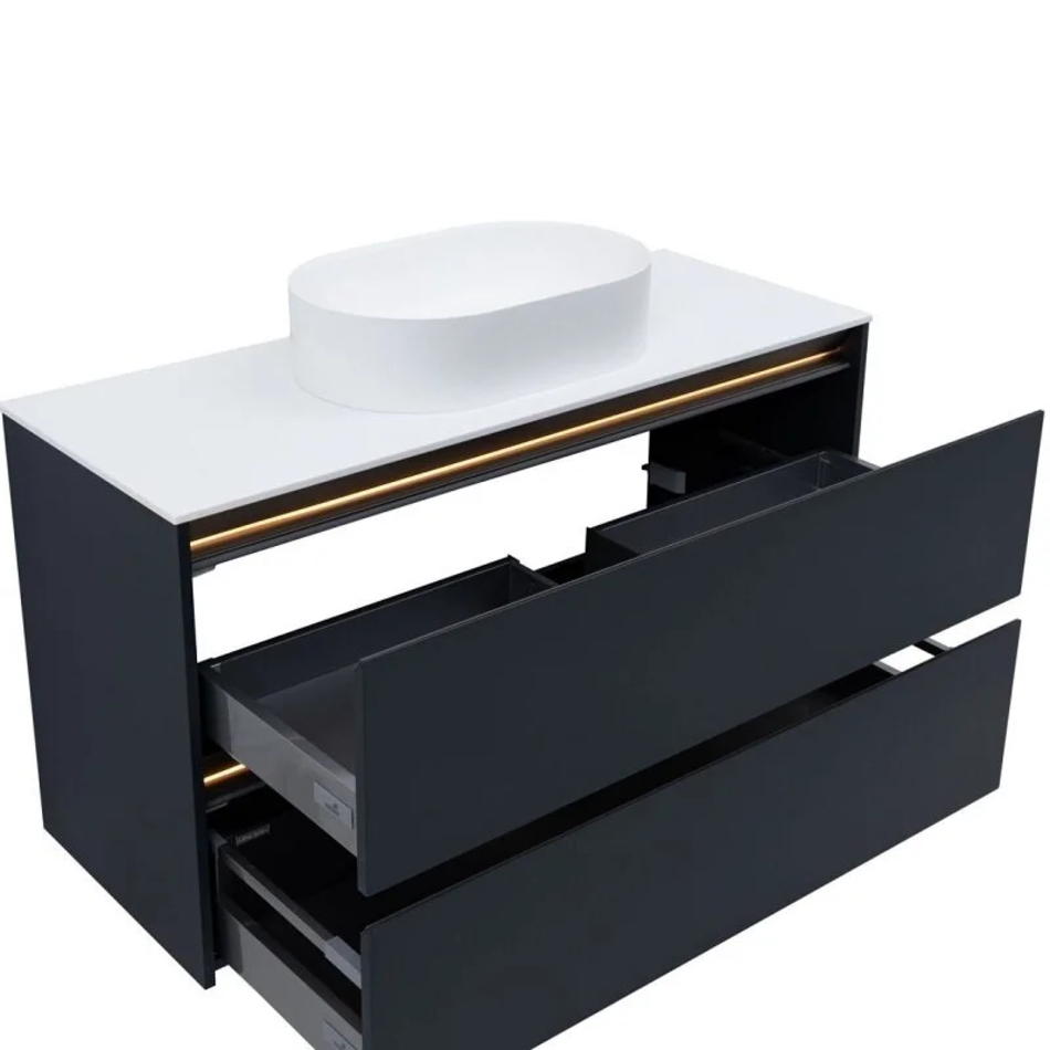 Корпус мебели на верхнем торце фасада имеет металлический декоративный профиль в цвете черный или олива. Тумбы и пеналы комплектуются подсветкой в теплом тоне и специальным магнитным датчиком, который позволяет использовать подсветку в 2-х режимах: «декоративная подсветка» - всегда включена и «функциональная подсветка» - включается при открывании ящика или пенала.