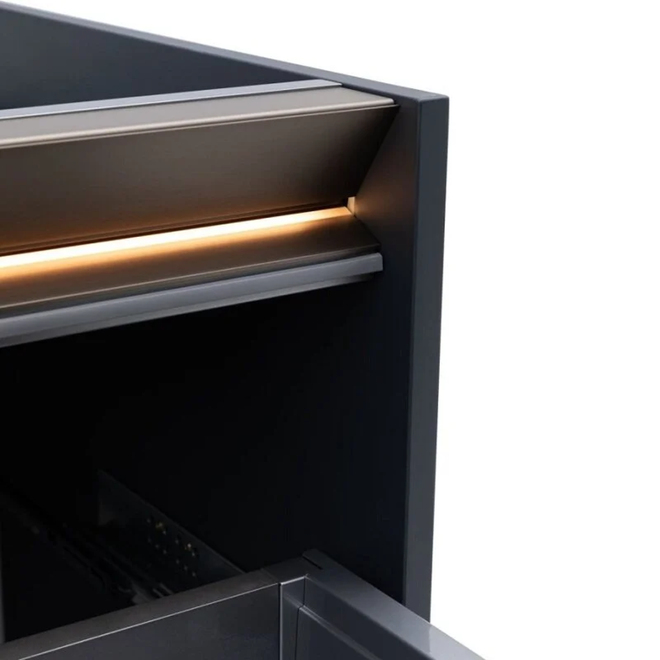 Корпус мебели на верхнем торце фасада имеет металлический декоративный профиль в цвете черный или олива. Тумбы и пеналы комплектуются подсветкой в теплом тоне и специальным магнитным датчиком, который позволяет использовать подсветку в 2-х режимах: «декоративная подсветка» - всегда включена и «функциональная подсветка» - включается при открывании ящика или пенала.