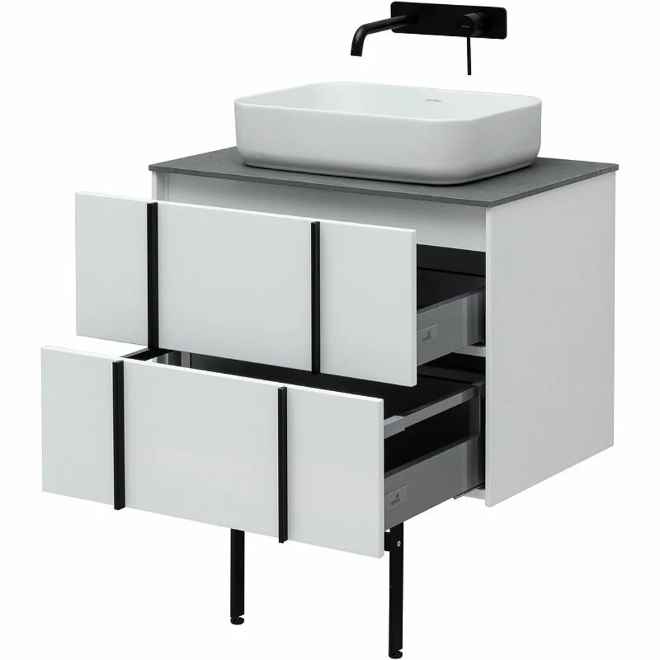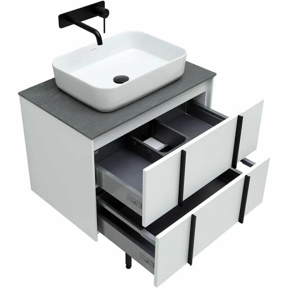 Изюминкой коллекции являются стильные и оригинальные металлические ручки, которые образуют единую линию с ножками тумбы. Сочетание цветов отделки фасадов и декоративных элементов позволяют получить неповторимые интерьерные решения. Разнообразие вариантов для хранения: система органайзеров для тумбы, выдвижные ящики, помогают организовать пространство ванной комнаты с комфортом. Автоматическая сборка с помощью пневматического пресса Homag (Germany). 100% эмаль. 7 слоев эмали, нанесенных роботом, тумбы полностью окрашены. Фурнитура высокого класса Hettich Inno Tech ATIRA (Germany). Выдвижные ящики с металлическими боковыми стенками в цвете серый металлик. Плавное закрывание ящиков, полное выдвижение, прочное дно (толщина 16 мм), нагрузка до 30 кг. Надежные подвески Häfele (Germany) с возможностью регулировки по высоте, нагрузка до 130 кг. Тумбы оснащены специальной пластиковой рамой, которая надежно защищает вырез под сифон, служит органайзером и позволяет закрепить дополнительный набор контейнеров для хранения. Стильные ручки и опоры выполнены из металла, имеют брашированную поверхность с нанесением цвета путем анодирования.
