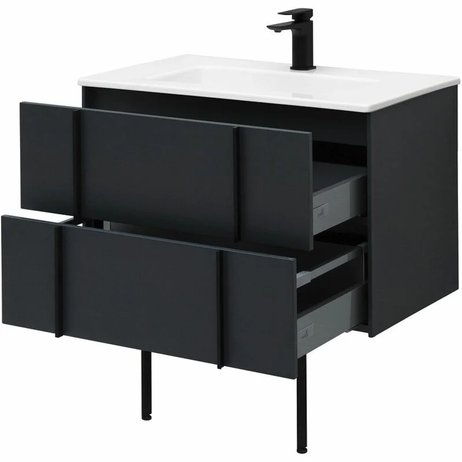 Изюминкой коллекции являются стильные и оригинальные металлические ручки, которые образуют единую линию с ножками тумбы. Сочетание цветов отделки фасадов и декоративных элементов позволяют получить неповторимые интерьерные решения. Разнообразие вариантов для хранения: система органайзеров для тумбы, выдвижные ящики, помогают организовать пространство ванной комнаты с комфортом. Автоматическая сборка с помощью пневматического пресса Homag (Germany). 100% эмаль. 7 слоев эмали, нанесенных роботом, тумбы полностью окрашены. Фурнитура высокого класса Hettich Inno Tech ATIRA (Germany). Выдвижные ящики с металлическими боковыми стенками в цвете серый металлик. Плавное закрывание ящиков, полное выдвижение, прочное дно (толщина 16 мм), нагрузка до 30 кг. Надежные подвески Häfele (Germany) с возможностью регулировки по высоте, нагрузка до 130 кг. Тумбы оснащены специальной пластиковой рамой, которая надежно защищает вырез под сифон, служит органайзером и позволяет закрепить дополнительный набор контейнеров для хранения. Стильные ручки и опоры выполнены из металла, имеют брашированную поверхность с нанесением цвета путем анодирования.