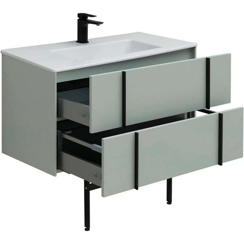 Изюминкой коллекции являются стильные и оригинальные металлические ручки, которые образуют единую линию с ножками тумбы. Сочетание цветов отделки фасадов и декоративных элементов позволяют получить неповторимые интерьерные решения. Разнообразие вариантов для хранения: система органайзеров для тумбы, выдвижные ящики, помогают организовать пространство ванной комнаты с комфортом. Автоматическая сборка с помощью пневматического пресса Homag (Germany). 100% эмаль. 7 слоев эмали, нанесенных роботом, тумбы полностью окрашены. Фурнитура высокого класса Hettich Inno Tech ATIRA (Germany). Выдвижные ящики с металлическими боковыми стенками в цвете серый металлик. Плавное закрывание ящиков, полное выдвижение, прочное дно (толщина 16 мм), нагрузка до 30 кг. Надежные подвески Häfele (Germany) с возможностью регулировки по высоте, нагрузка до 130 кг. Тумбы оснащены специальной пластиковой рамой, которая надежно защищает вырез под сифон, служит органайзером и позволяет закрепить дополнительный набор контейнеров для хранения. Стильные ручки и опоры выполнены из металла, имеют брашированную поверхность с нанесением цвета путем анодирования.