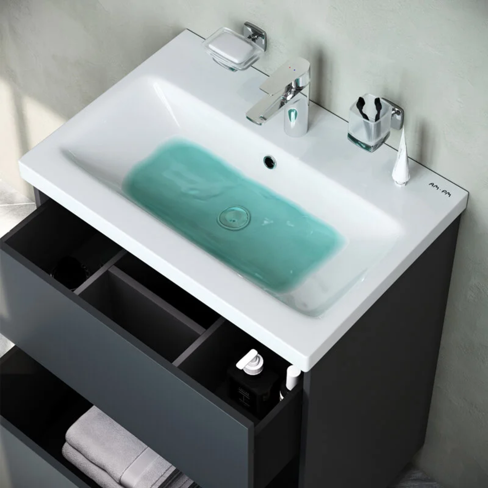 Хотите выделиться при ограниченном бюджете? Трендовый дизайн мебели для ванной комнаты Gem не уступает комплектам по гораздо более высокой цене. Удобный демонтаж без использования инструментов и легкая регулировка ящиков: благодаря надёжному соединению направляющей и ящика при помощи особого фиксатора.Впервые в доступном сегменте: фурнитура push-to-open последнего поколения. Экологически чистые и удивительно долговечные полиакриловые эмали – специальная технология покраски в 7 слоев превосходит технологию нанесения автоэмали у ведущих немецких марок и обеспечивает насыщенный цвет в течение всего срока службы (от 10 лет).