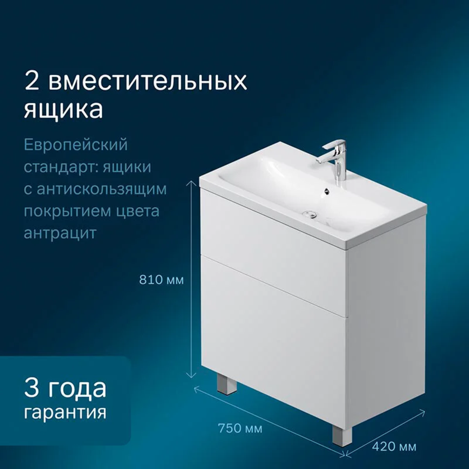 Хотите выделиться при ограниченном бюджете? Трендовый дизайн мебели для ванной комнаты Gem не уступает комплектам по гораздо более высокой цене. Удобный демонтаж без использования инструментов и легкая регулировка ящиков: благодаря надёжному соединению направляющей и ящика при помощи особого фиксатора.Впервые в доступном сегменте: фурнитура push-to-open последнего поколения.Экологически чистые и удивительно долговечные полиакриловые эмали – специальная технология покраски в 7 слоев превосходит технологию нанесения автоэмали у ведущих немецких марок и обеспечивает насыщенный цвет в течение всего срока службы (от 10 лет).