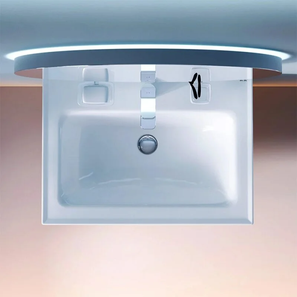 Встроенная керамическая раковина белоснежного цвета оснащена специальным бортиком для защиты от пролива воды за мебель.