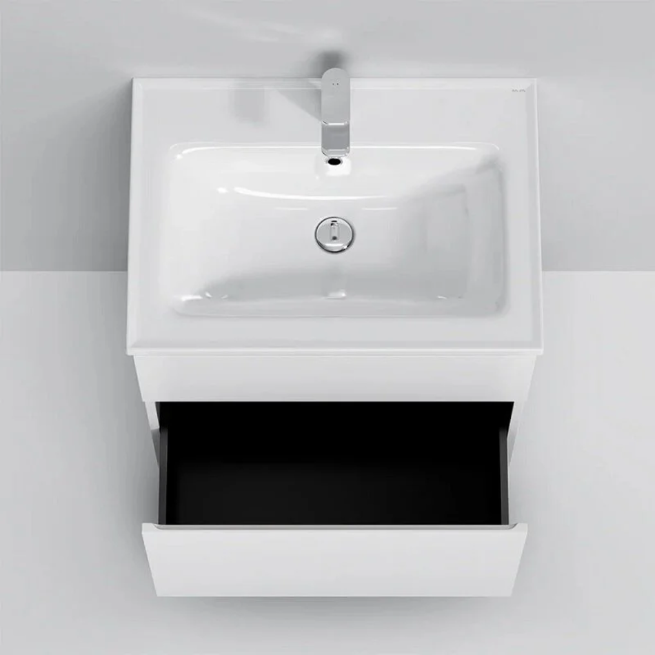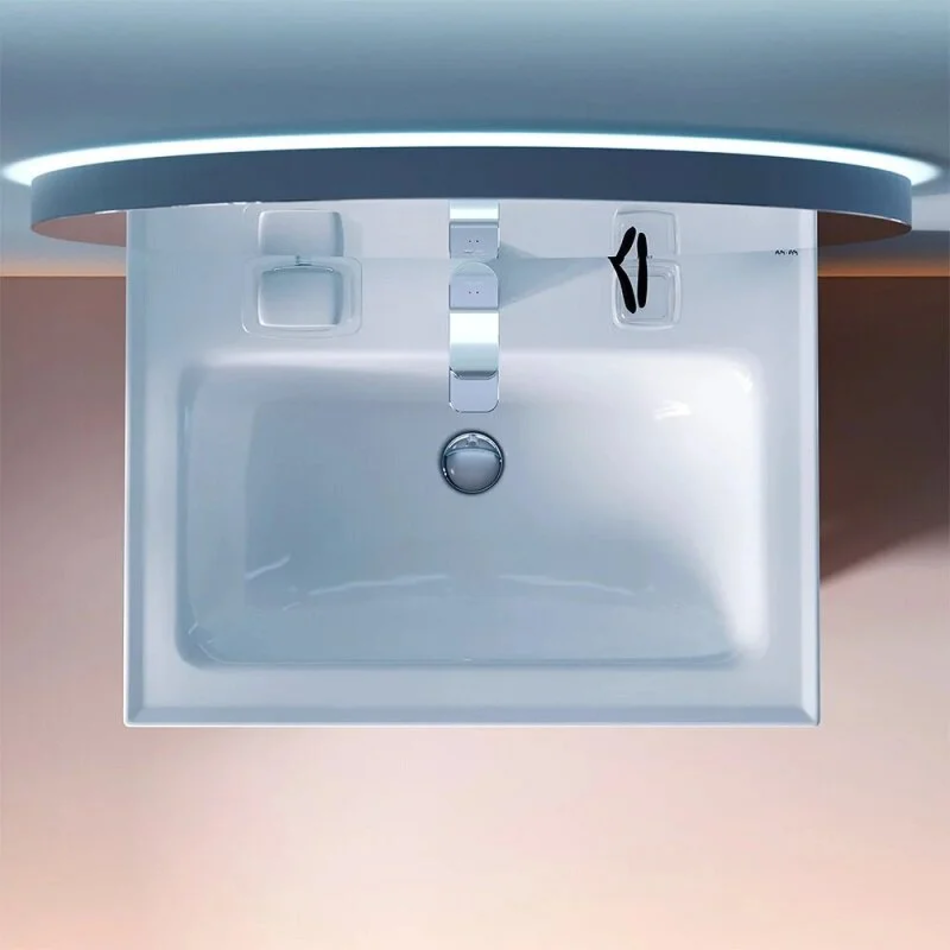 Встроенная керамическая раковина белоснежного цвета оснащена специальным бортиком для защиты от пролива воды за мебель.