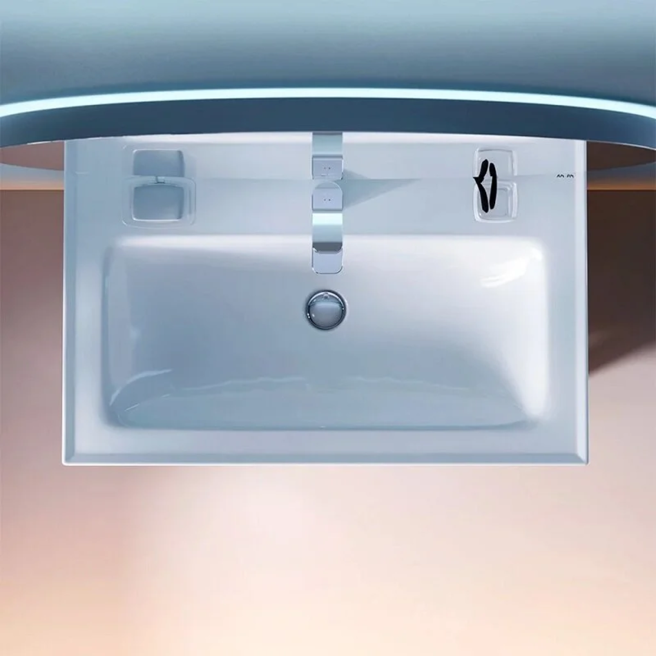 Встроенная керамическая раковина белоснежного цвета оснащена специальным бортиком для защиты от пролива воды за мебель.