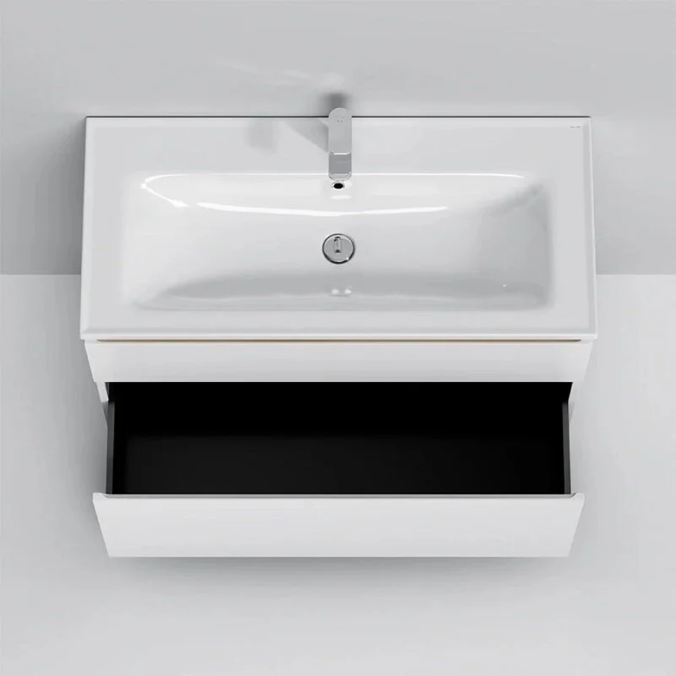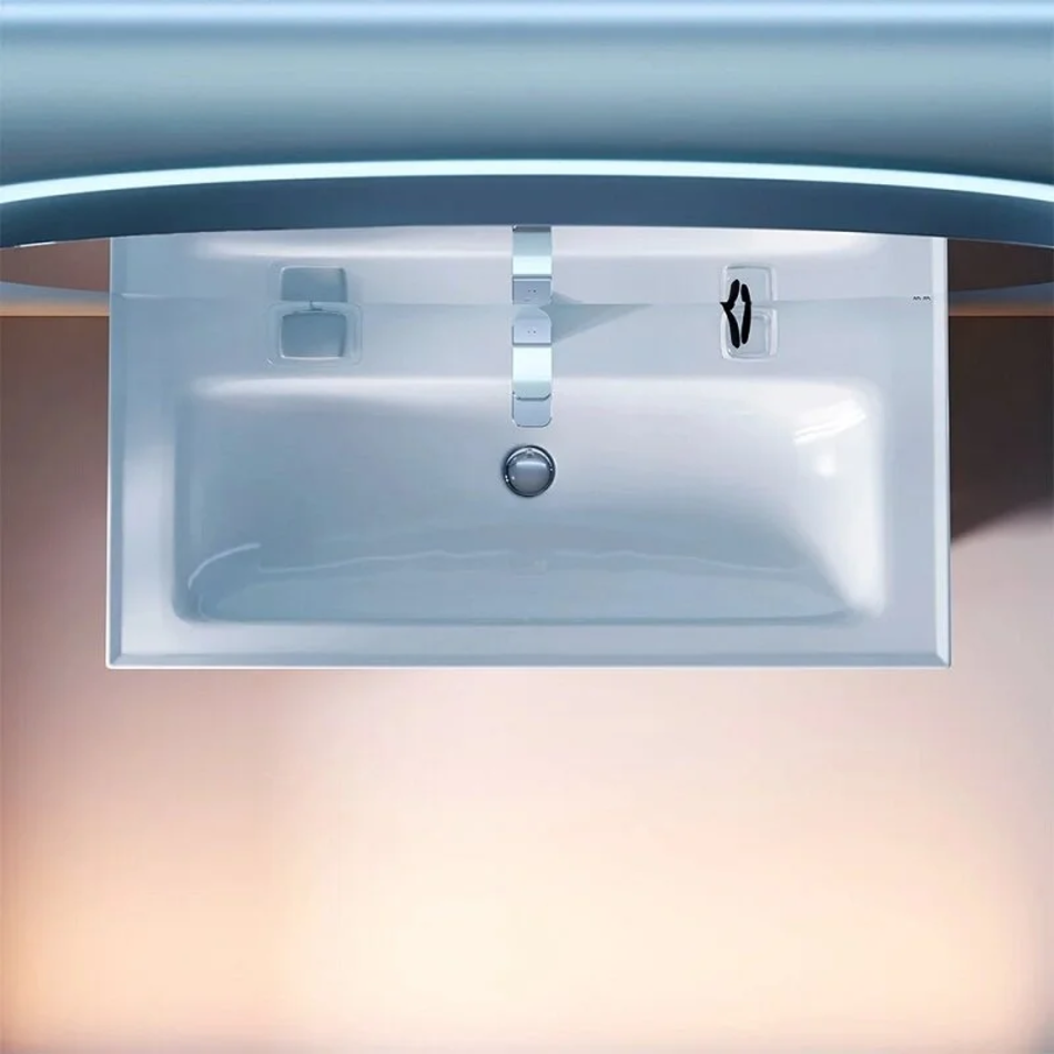 Встроенная керамическая раковина белоснежного цвета оснащена специальным бортиком для защиты от пролива воды за мебель.