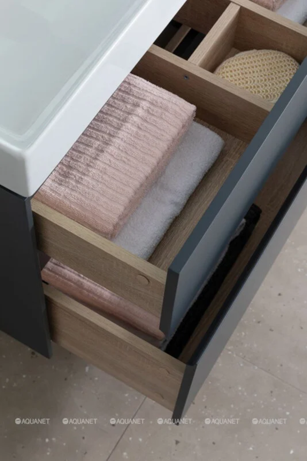 2 выдвижных ящика: нижний ящик тумбы имеет большую зону хранения, верхний разделен на несколько отделений для аксессуаров и ванных принадлежностей