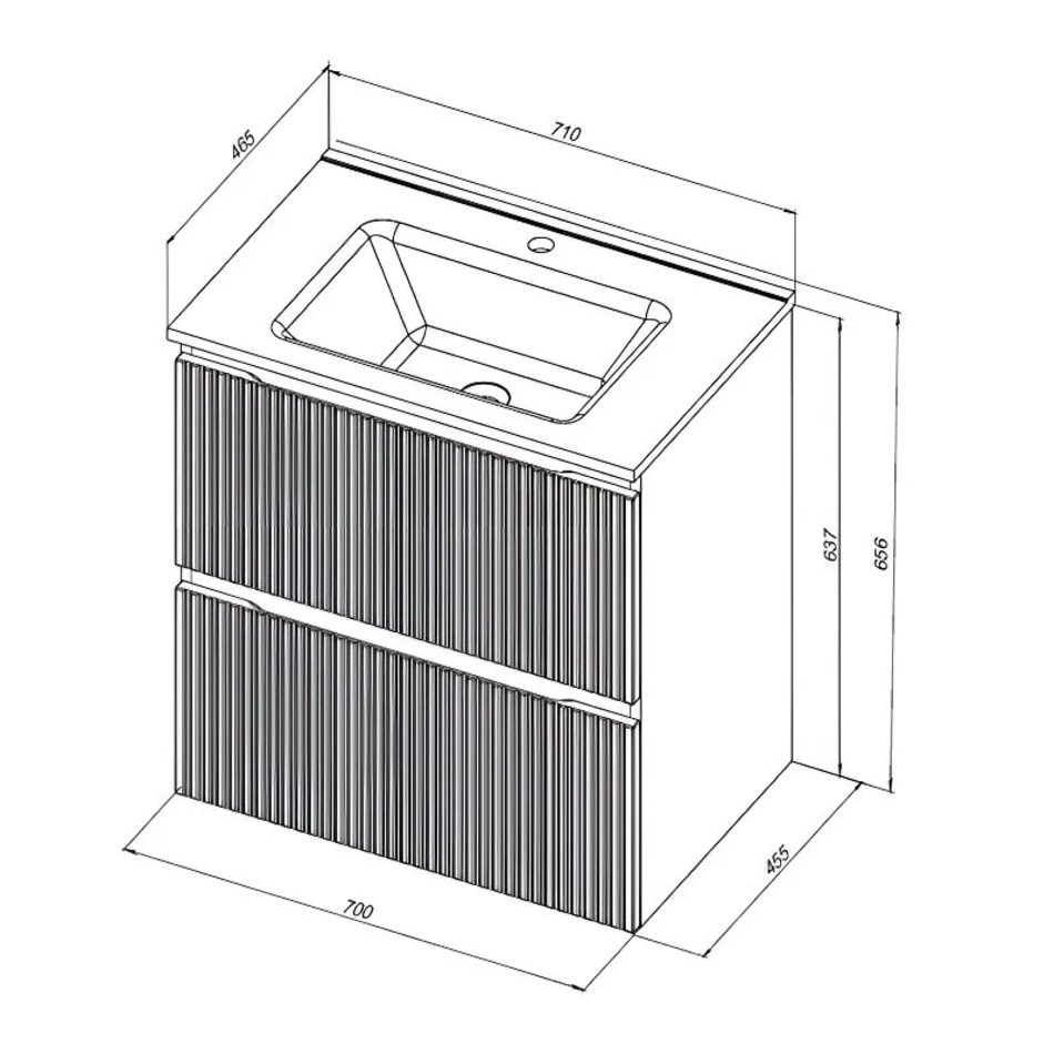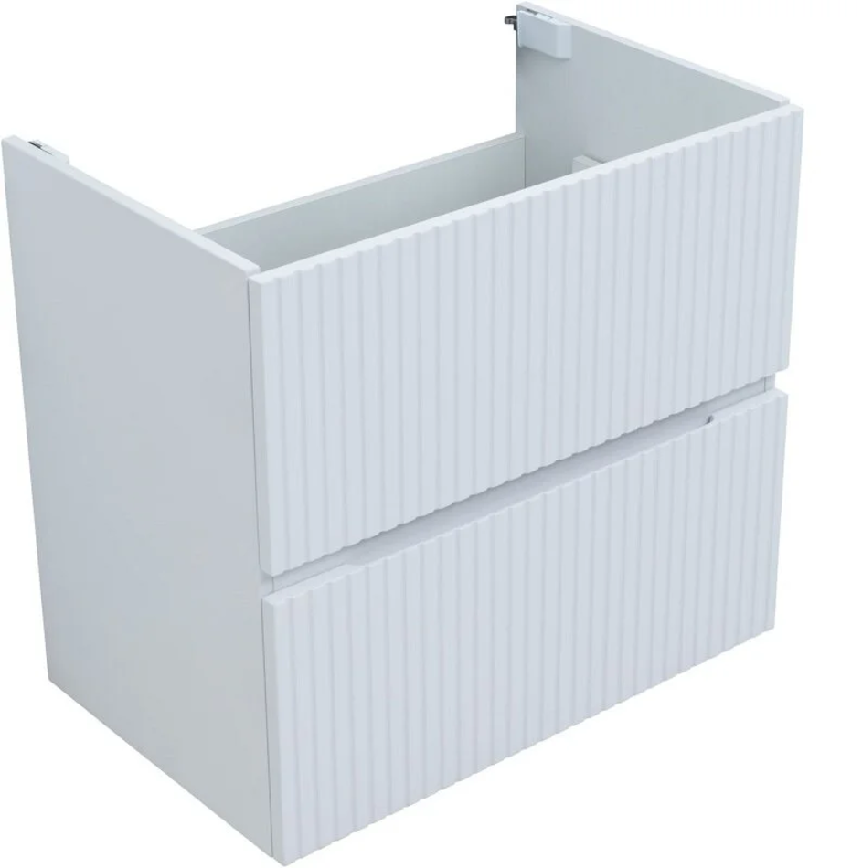Для изготовления фасадов и корпусов используется суперматовая пленка ПВХ повышенной прочности с эффектом «Soft touch». Мебель имеет приятную, бархатистую на ощупь поверхность, устойчивую к царапинам и воздействию влаги. Удобная интегрированная ручка. Актуальная вертикальная фрезеровка фасадов. Внутренние детали - влагостойкая ЛДСП. Прочное дно ящиков, выполненное из влагостойкой ЛДСП.