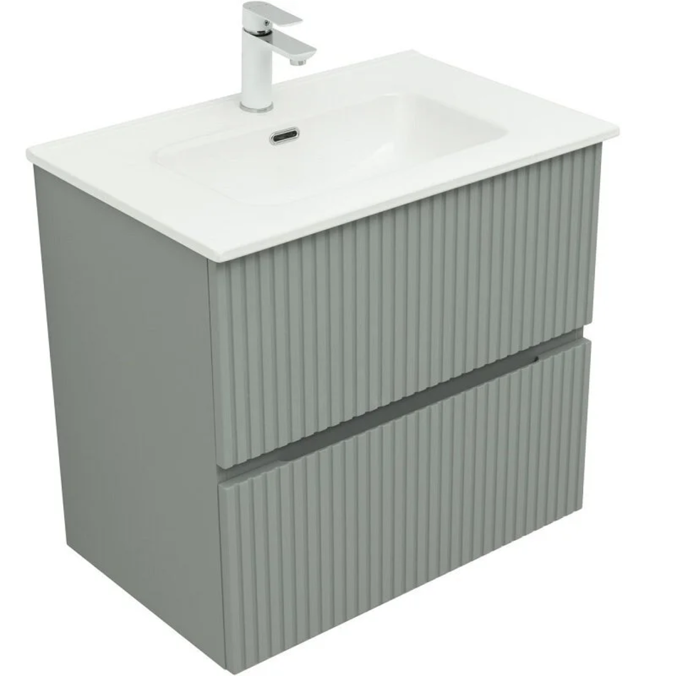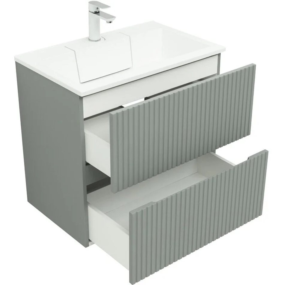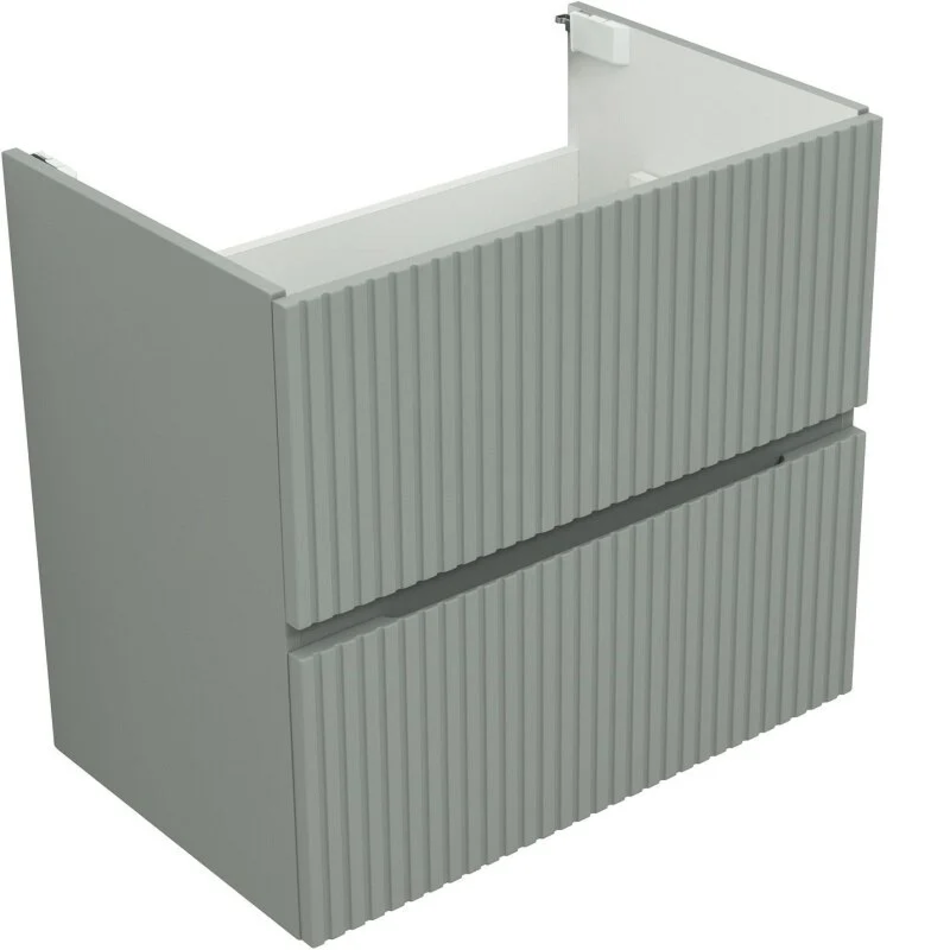 Для изготовления фасадов и корпусов используется суперматовая пленка ПВХ повышенной прочности с эффектом «Soft touch». Мебель имеет приятную, бархатистую на ощупь поверхность, устойчивую к царапинам и воздействию влаги. Удобная интегрированная ручка. Актуальная вертикальная фрезеровка фасадов. Внутренние детали - влагостойкая ЛДСП. Прочное дно ящиков, выполненное из влагостойкой ЛДСП.