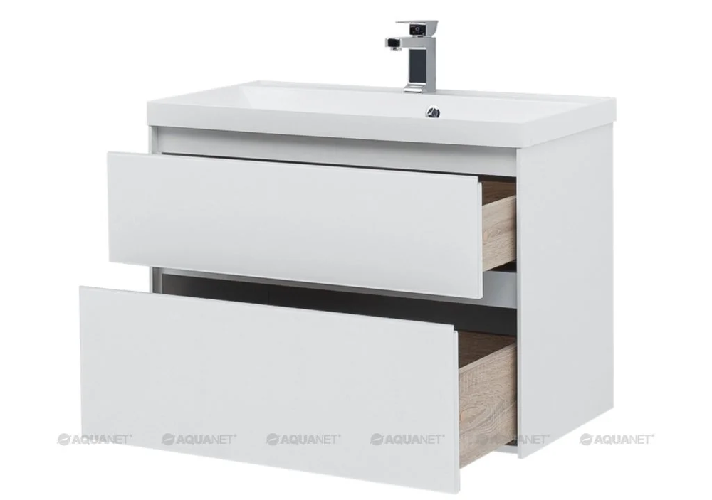 Тумба с раковиной Aquanet Гласс 100 белого цвета смотрится эффектно благодаря сочетанию белого матового стекла на фасаде верхнего выдвижного ящика с белоснежными глянцевыми поверхностями корпуса, выполненного из МДФ. Такое покрытие, к тому же, надежно защищает мебель от воздействия воды. «Изюминку» во внешний вид вносит внутренняя часть выдвижных ящиков, выполненная в цвете «дуб сонома». Древесная фактура вносит свежесть и живописность в дизайн всего изделия. Производители позаботились о деталях. Ящики лишены выступающих деталей, ручки интегрированы в фасад. Тумбу шириной 100 см можно из подвесного элемента преобразовать в напольный, просто докупив универсальные ножки. Раковина из литьевого мрамора «Орлеан» относится к числу накладных моделей и внешне выглядит как единое целое с тумбой. Ящики тумб оснащены направляющими Hettich Quadro c плавным закрыванием, более известным нам как доводчик.