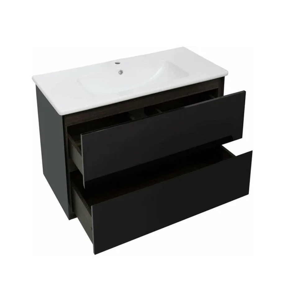 Тумба подвесная Размер: 99.6*45,3*63,5 см Выдвижные ящики:2 Механизм доводчика Материал: ЛДСП Покрытие: эмаль/глянец Цвет фурнитуры: хром Цвет: черный глянцевый