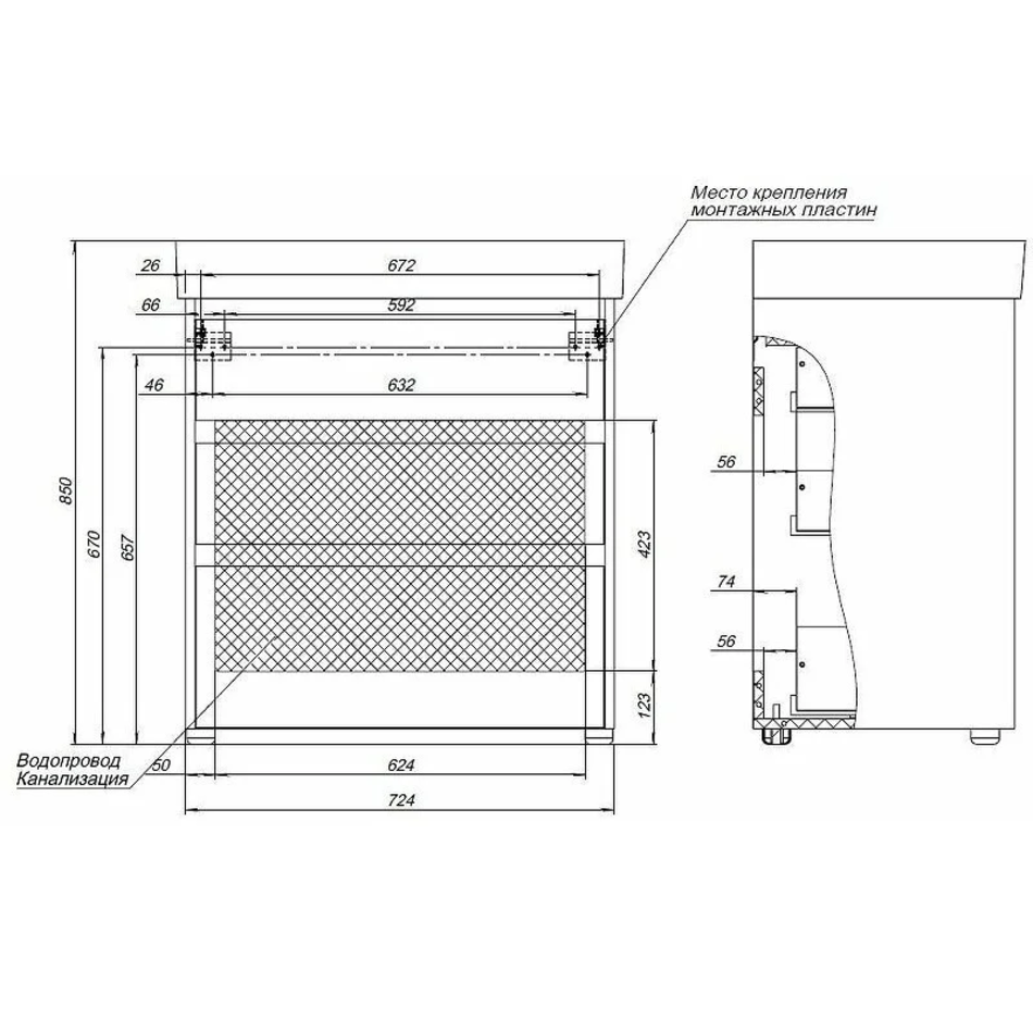 Габариты корпуса тумбы (ШxВxГ): 724х735х442 мм.
