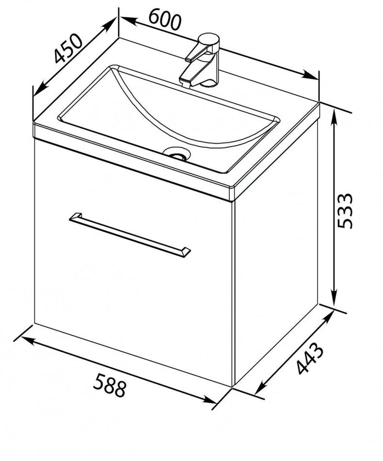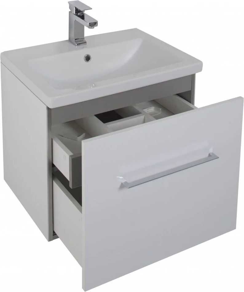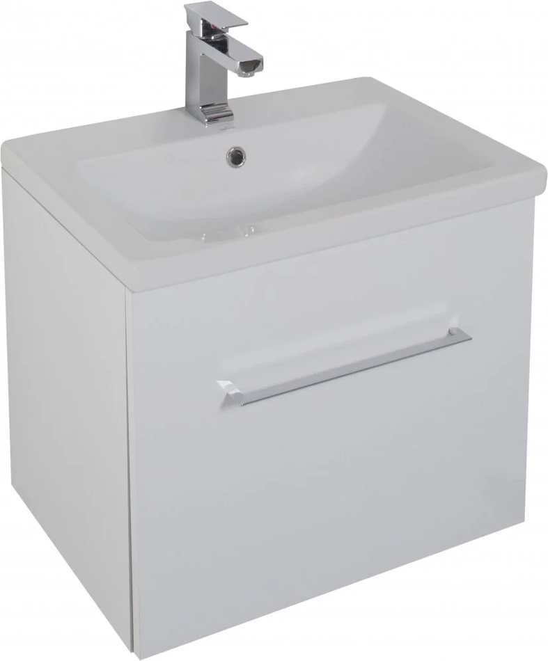 Тумба подвесная Размер: 60*45*53.5 см Ящики выдвижные: 1 Доводчики Материал: влагостойкий ЛДСП, МДФ Покрытие: краска/глянец Цвет фурнитуры: хром Цвет: белый