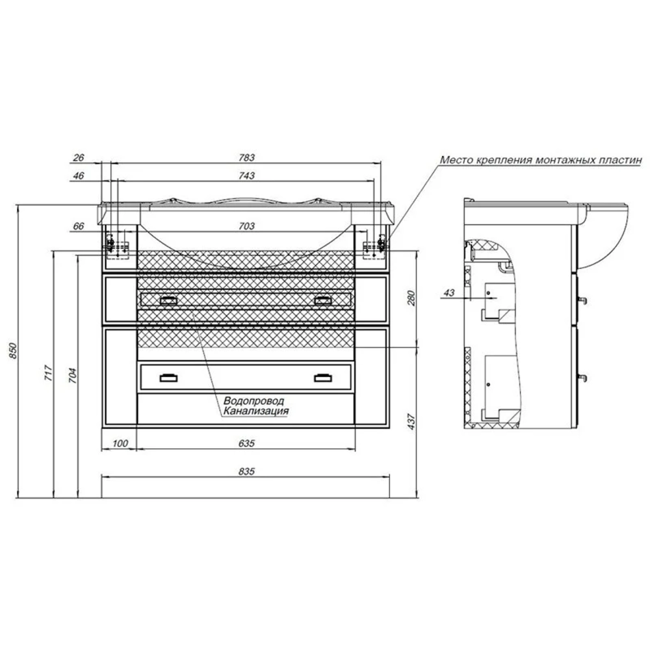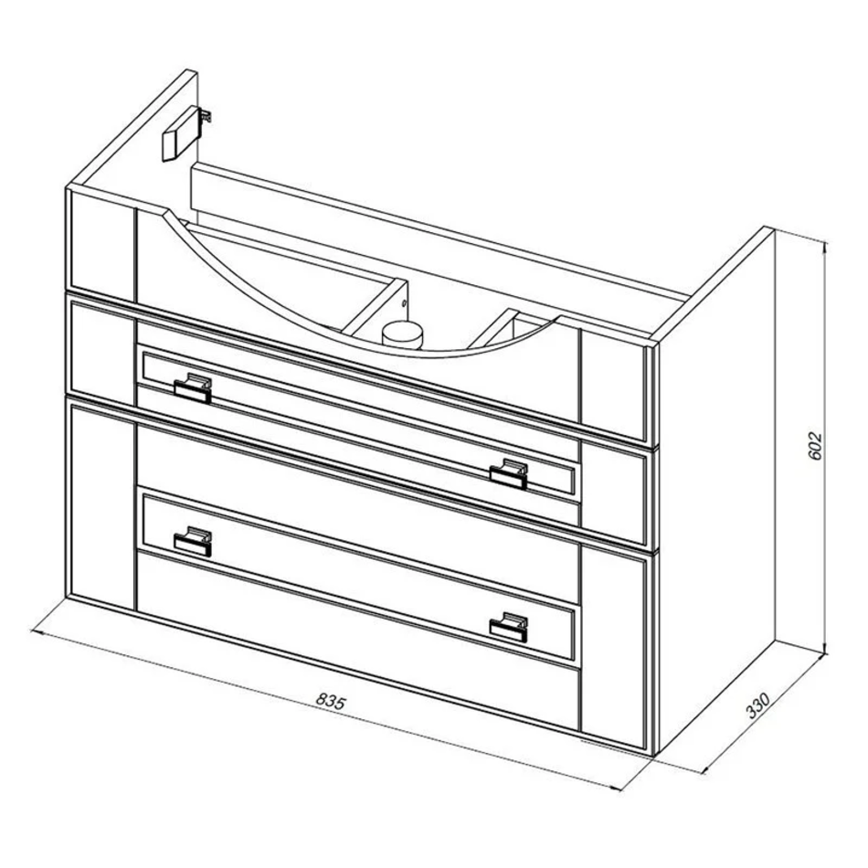 Тумба подвесная Размер: 85х33х60,2 см Ящики выдвижные: 2 Доводчики Материал: влагостойкий ЛДСП, МДФ Покрытие: эмаль Цвет фурнитуры: хром Цвет: белый Вес: 25 кг