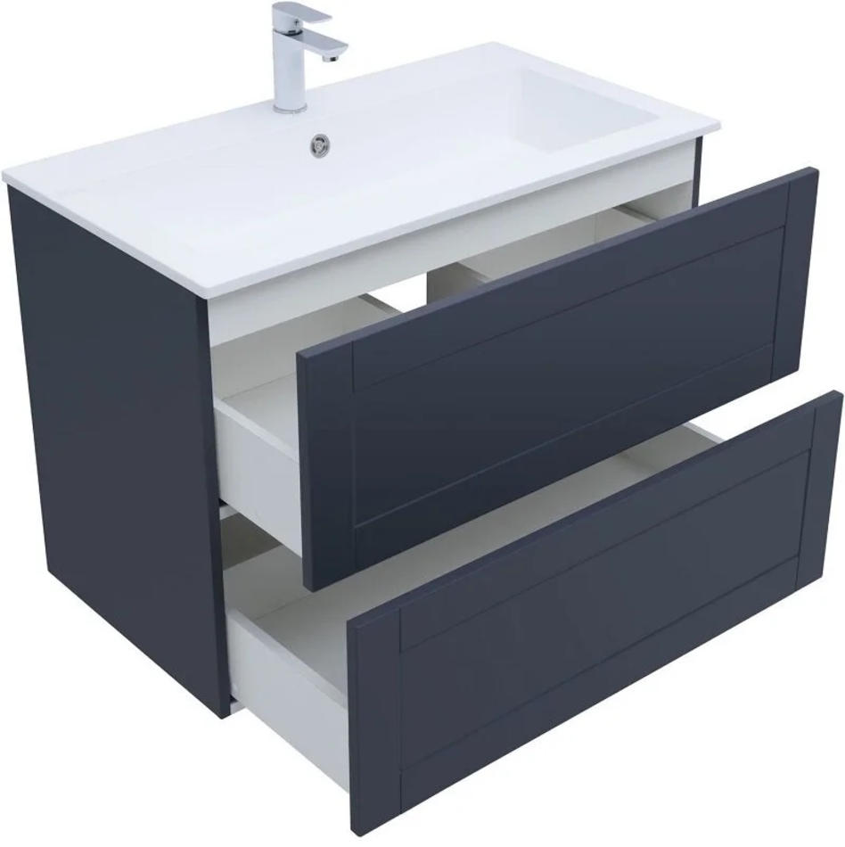 Для изготовления фасадов и корпусов используется суперматовая пленка ПВХ повышенной прочности с эффектом «Soft touch». Тумба имеет приятную, бархатистую на ощупь поверхность, устойчивую к царапинам и воздействию влаги. Глубина тумбы с раковиной - 500 мм. Выдвижные ящики открываются нажатием на фасад (направляющие с системой рush-to-open). Материал ящиков и внутренних деталей - ВЛДСП