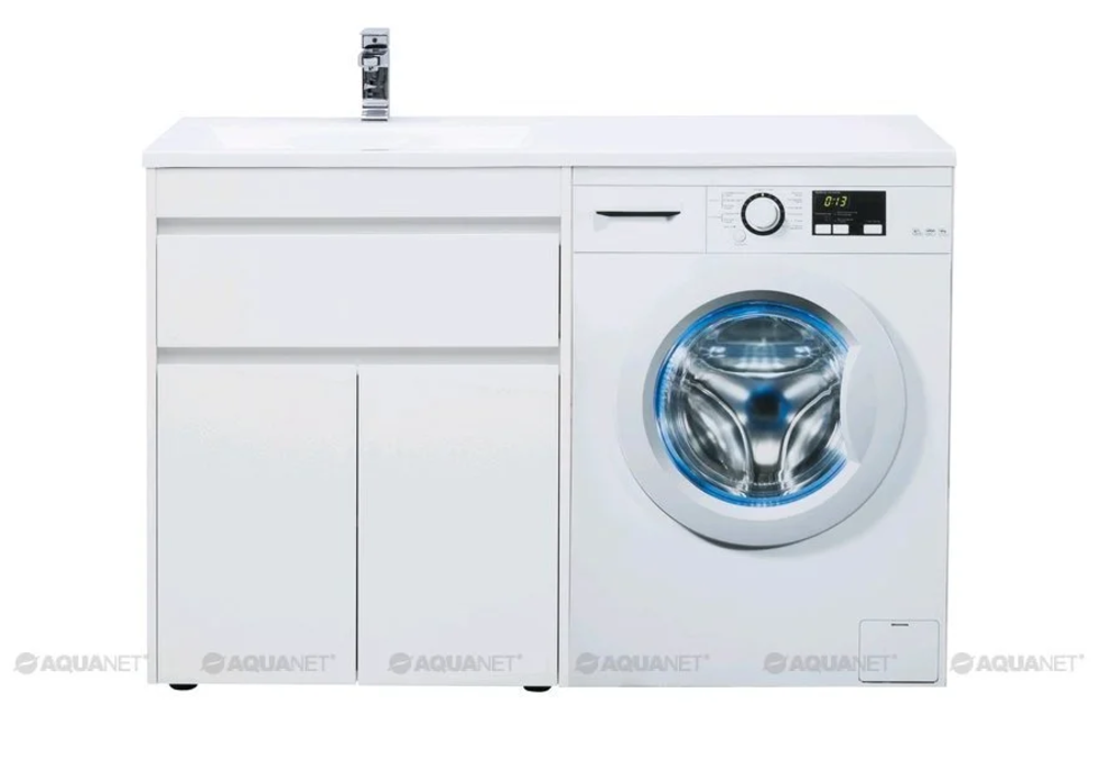 Корпус тумбы выполнен из влагостойкого ЛДСП, а фасады – из МДФ с покрытием эмалью. Разнообразные зоны хранения в тумбе шириной 680 мм скрыты в ящике и за распашными дверками. Тумбу можно использовать и без соседства со стиральной машиной, а свободное пространство под платформой раковины занять подкатной тумбой, приспособлениями для уборки помещения или столиком.