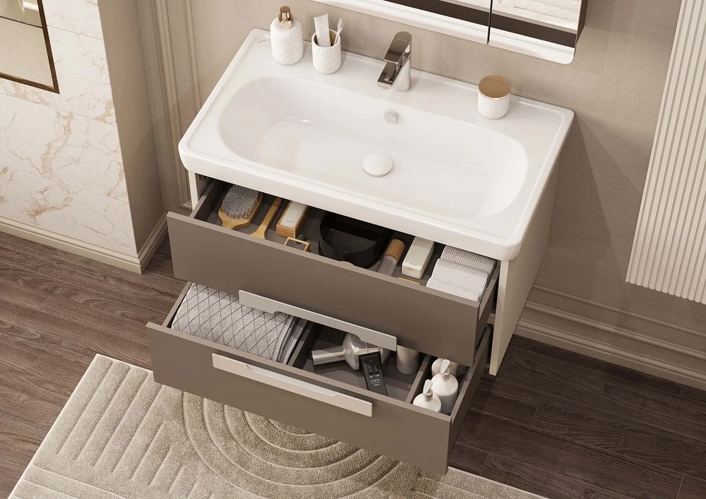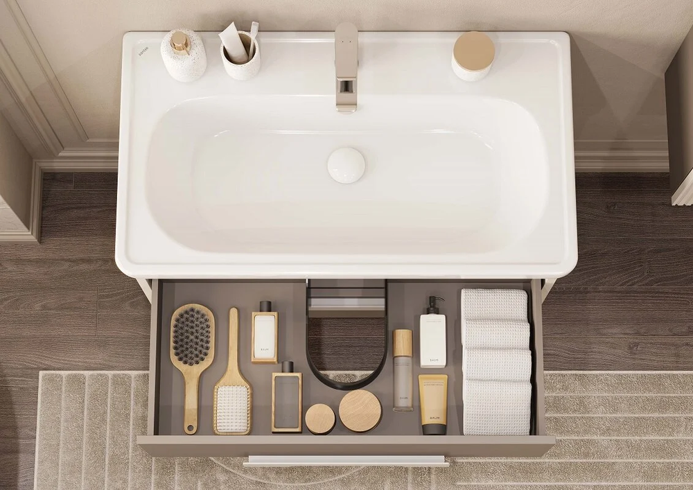 В тумбе есть два вместительных ящика с эргономичной организацией пространства, которую можно настроить по своему удобству. Ящики открываются при помощи удобной ручки, а благодаря направляющим с доводчиками обеспечивается плавное закрывание, что гарантирует бесшумность и комфорт использования мебели.