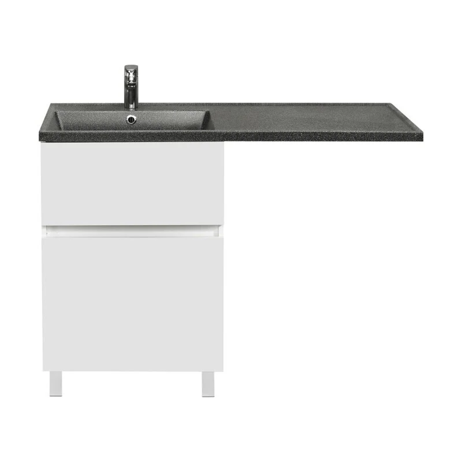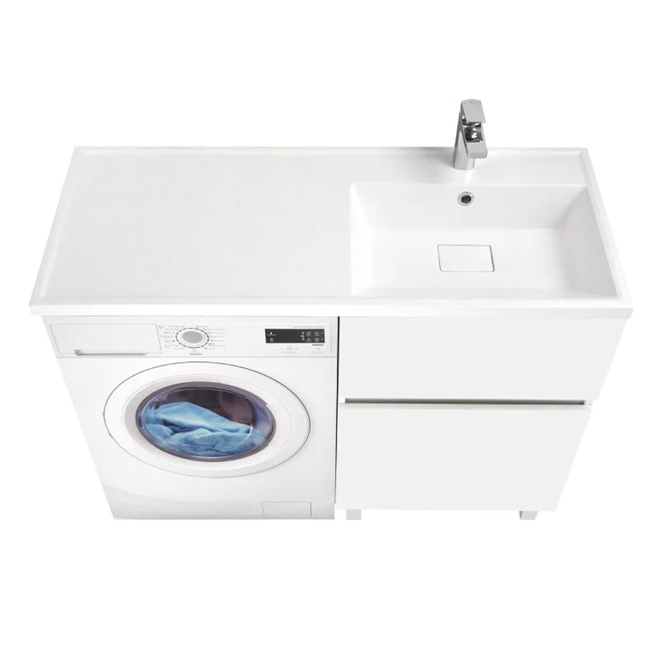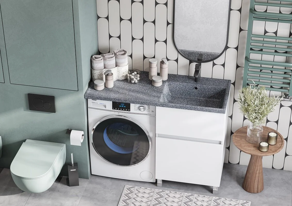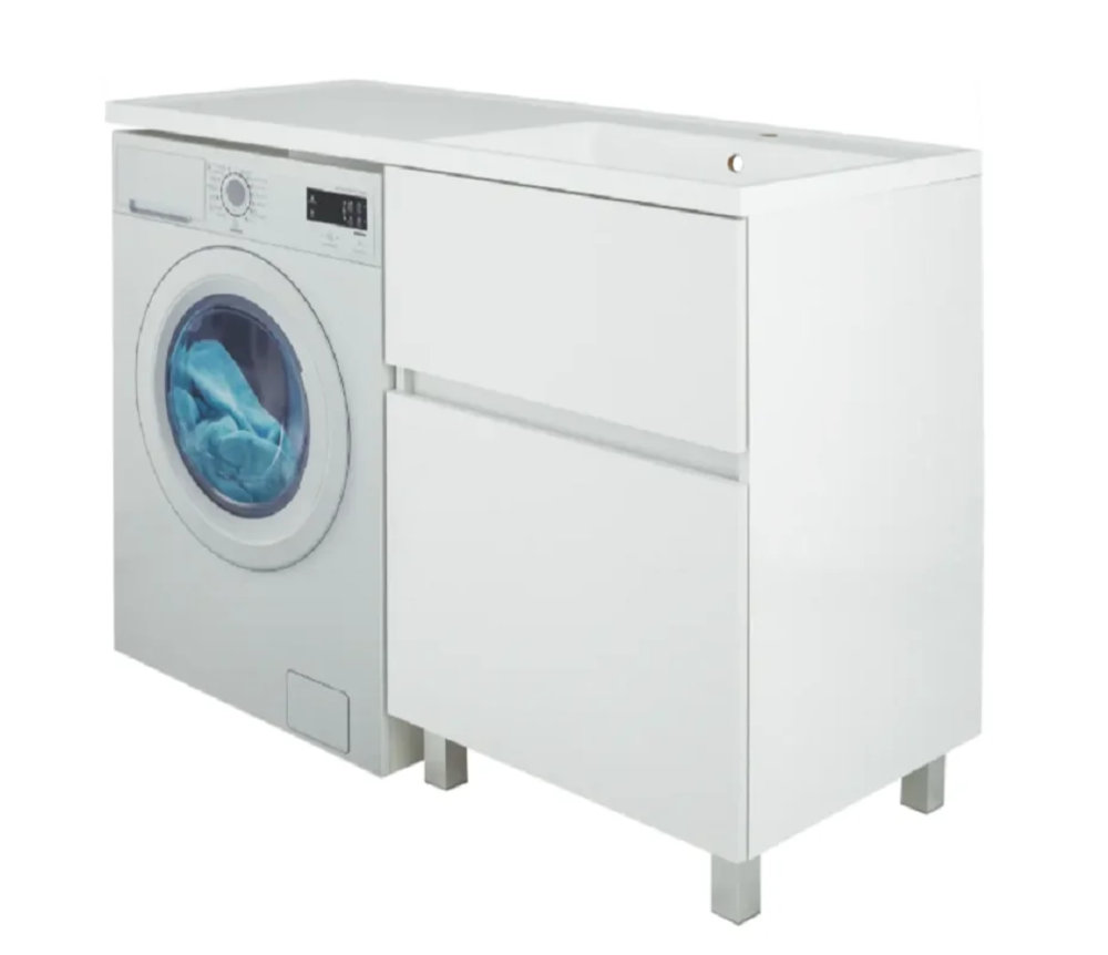 Мебель совмещается со стиральной машиной и позволяет органично и компактно разместить раковину.