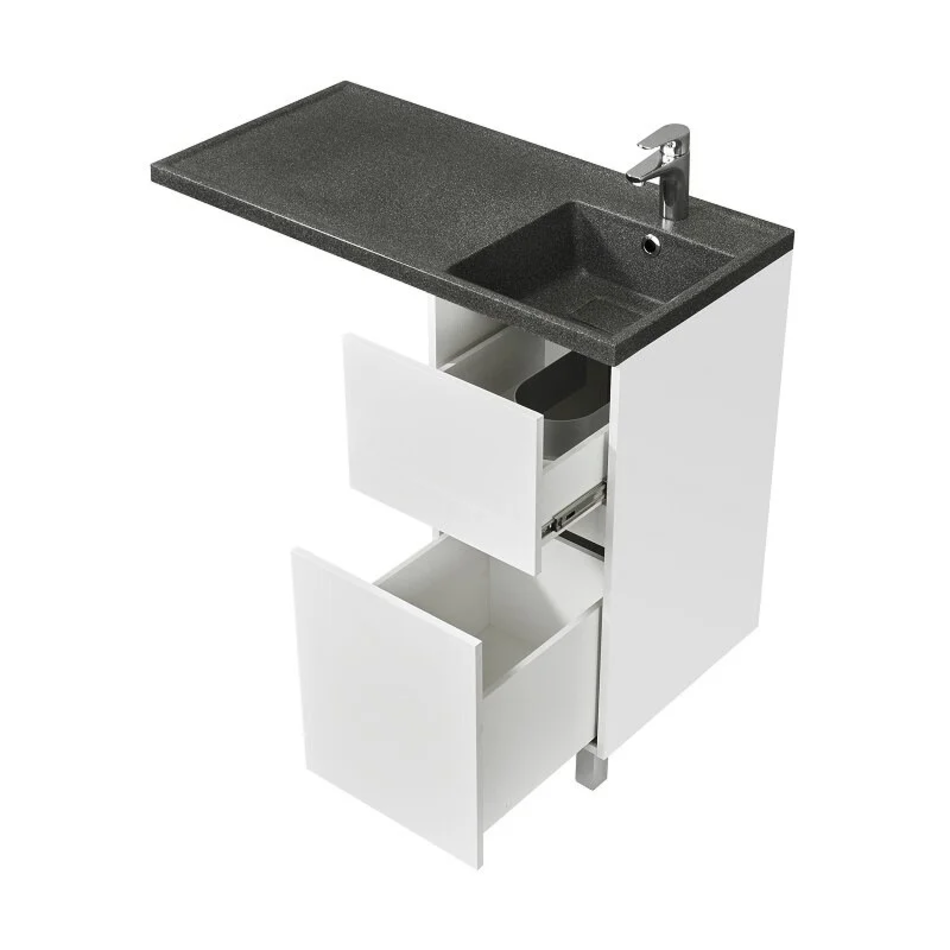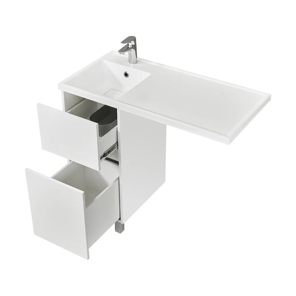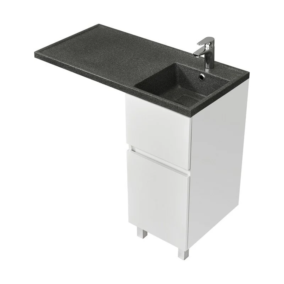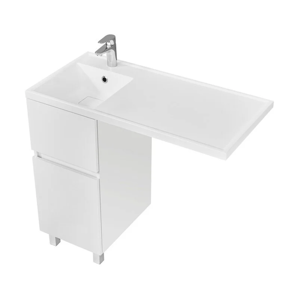 Мебель совмещается со стиральной машиной и позволяет органично и компактно разместить раковину. Внутри тумбы можно хранить средства для стирки и другую бытовую химию.
