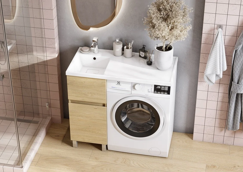 Тумба под стиральную машину Лайн 40 поможет правильно спланировать пространство тесной ванной комнаты. Мебель совмещается со стиральной машиной и позволяет органично и компактно разместить раковину.