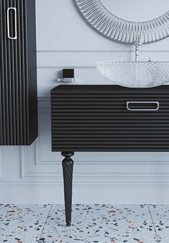 Рифленые фасады тумб выполнены из МДФ с ультраглянцевым акриловым покрытием High-Pressure Membrane Coating от известного производителя LG. В коллекции использована фурнитура от лидера рынка Hettich.