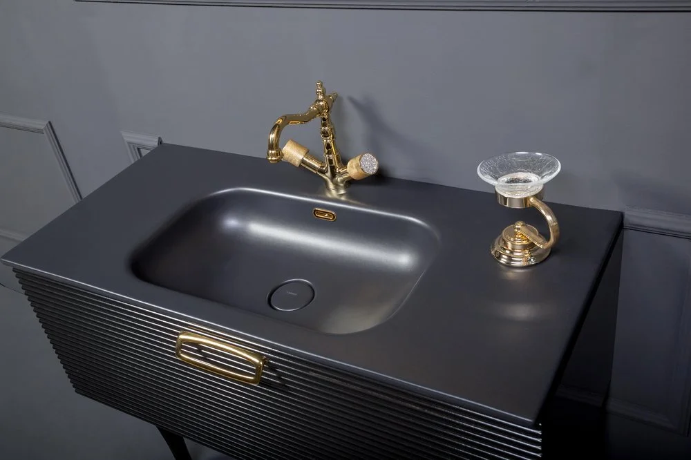 Тумба под раковину Размер: 100 x 46 x 38 см Монтаж: подвесной Ящики выдвижные: 1 Система плавного закрывания Материал: МДФ Форма: прямоугольная Цвет: черный, золото